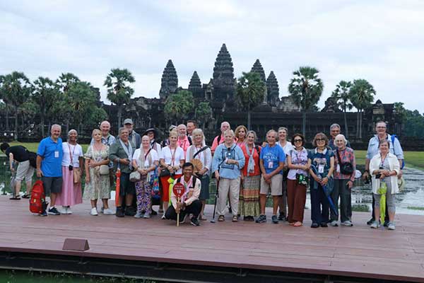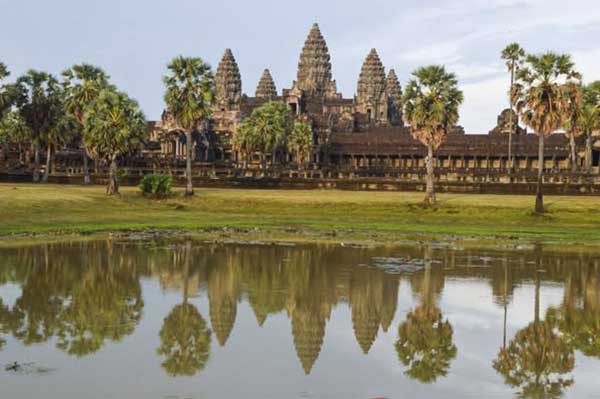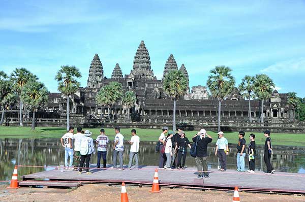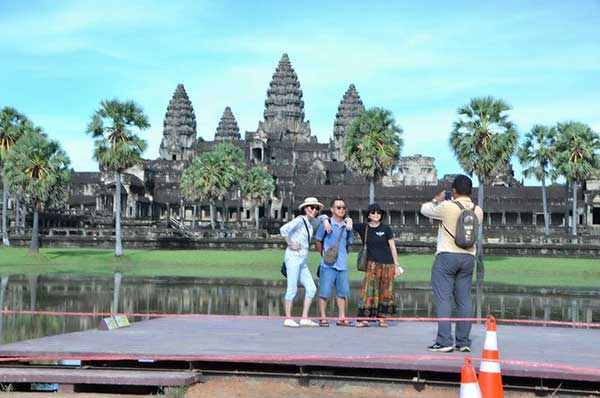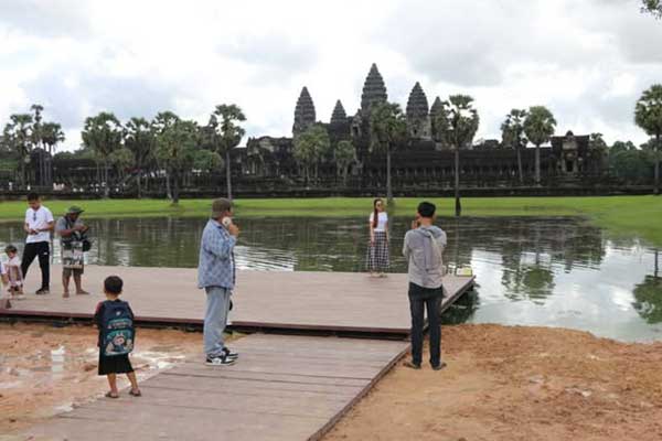 ស្រះទឹកខាងត្បូងប្រាសាទអង្គរវត្តជាទីកន្លែងដ៏ពេញនិយមរបស់ទេសចរចម្រុះជាតិសាសន៍ដើម្បីផ្តិតរូបភាពកំពូលទាំង៥នៃប្រាសាទអង្គរវត្ត។