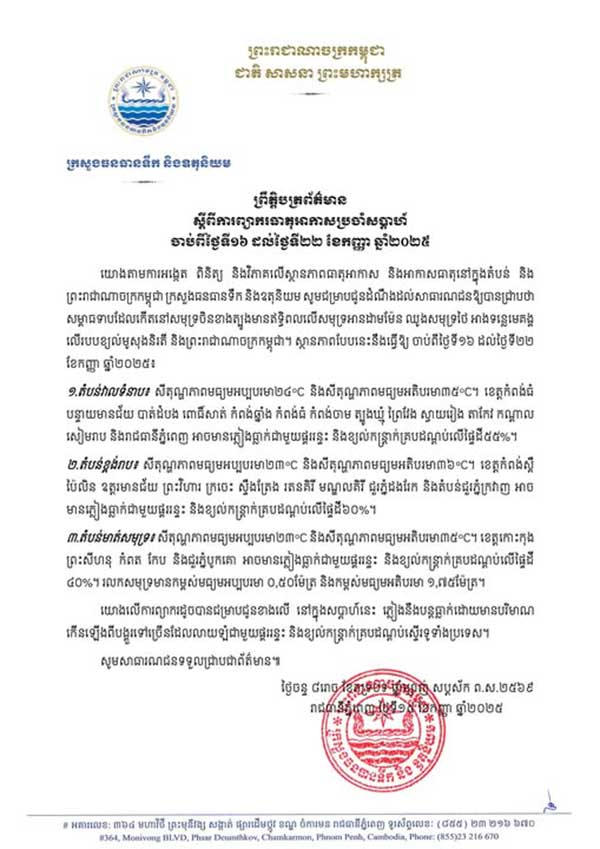 ក្រសួងធនធានទឹក និងឧតុនិយម កាលពីម្សិលមិញ បានចេញព្រឹត្តិបត្រព័ត៌មាន ស្តីពីការព្យាករធាតុអាកាសប្រចាំសប្តាហ៍ ចាប់ពីថ្ងៃទី១៦ ដល់ថ្ងៃទី២២ ខែកញ្ញា ឆ្នាំ២០២៥៖