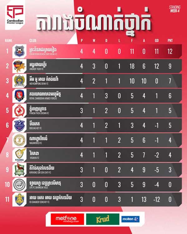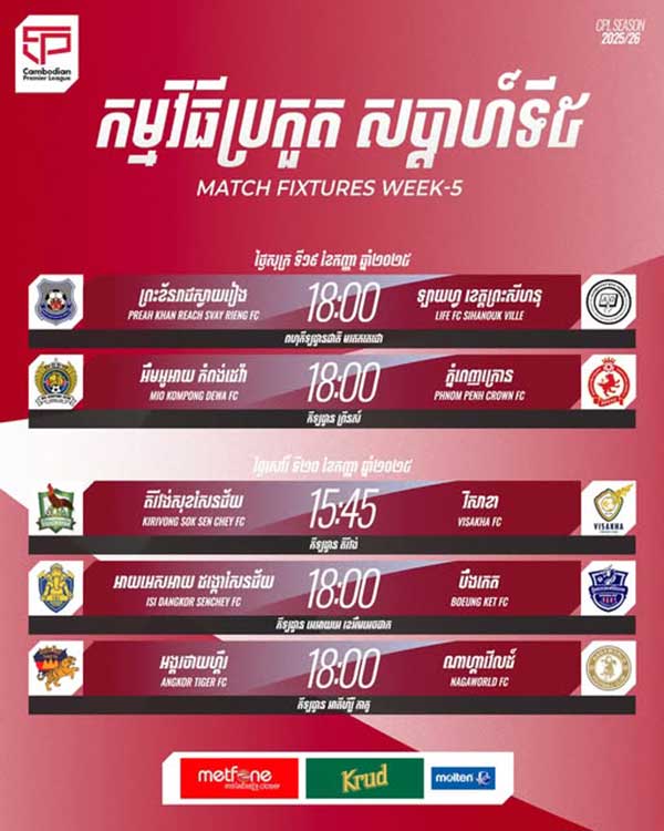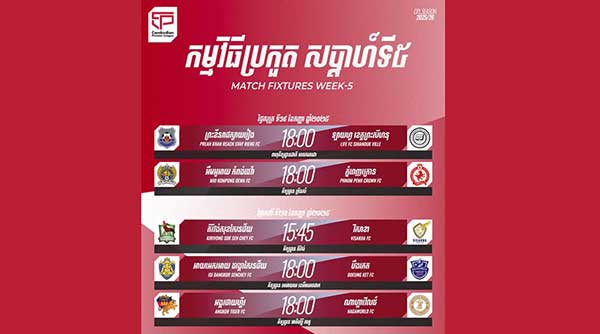 ការប្រកួតជម្រើសជើងឯកខេមបូឌានព្រីមៀរលីគ ឆ្នាំ២០២៥/២៦ នឹងឈានចូលសប្តាហ៍ទី៥ នៅថ្ងៃសុក្រ ទី១៩ និងថ្ងៃសៅរ៍ ទី២០ ខែកញ្ញា ឆ្នាំ២០២៥ ខណៈកម្មវិធីប្រកួត មានដូចខាងក្រោមនេះ