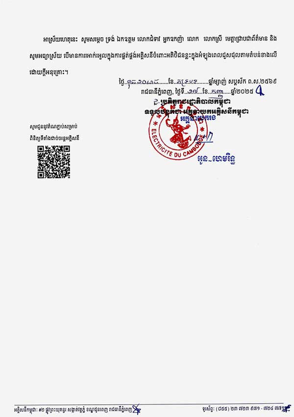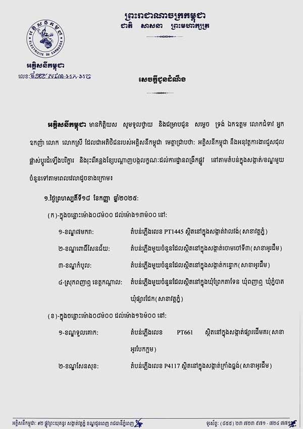 សូមអានសេចក្តីជូនដំណឹង របស់អគ្គិសនីកម្ពុជា ដូចខាងក្រោម ៖