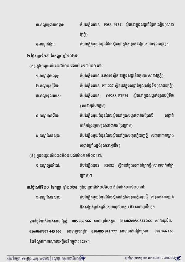 (ភ្នំពេញ)៖ អគ្គិសនីកម្ពុជា (EDC) បានចេញសេចក្តីជូនដំណឹង ស្តីពីការអនុវត្តការងារជួសជុល ផ្លាស់ប្តូរដំឡើងបរិក្ខារនានា និងរុះរើគន្លងខ្សែបណ្តាញ អគ្គិសនីរបស់អគ្គិសនីកម្ពុជា ដើម្បីបង្កលក្ខណៈងាយស្រួលដល់ការដ្ឋានពង្រីកផ្លូវ នៅថ្ងៃទី១៨ ខែកញ្ញា ឆ្នាំ២០២៥ ដល់ថ្ងៃទី២០ ខែកញ្ញា ឆ្នាំ២០២៥ នៅតំបន់មួយចំនួនទៅតាមពេលវេលា និងទីកន្លែងដូចសេចក្តីជូនដំណឹងលម្អិតខាងក្រោម ។