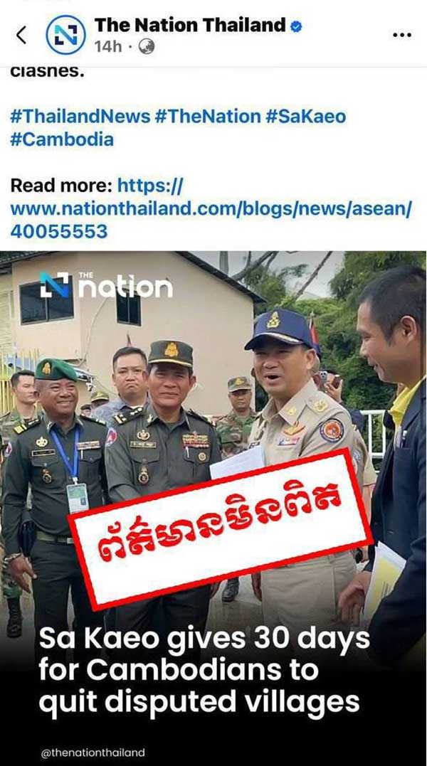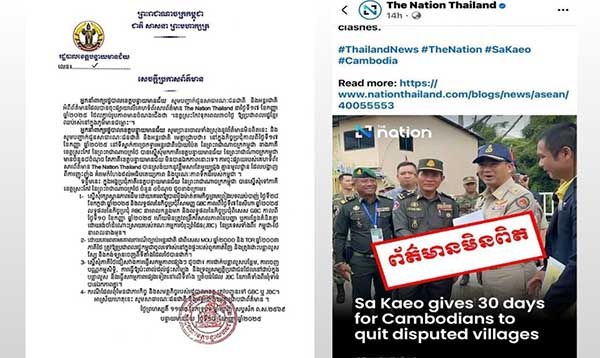 អ្នកនាំពាក្យរដ្ឋបាលខេត្តបន្ទាយមានជ័យ ចេញសេចក្ដីប្រកាសព័ត៌មាន ច្រានចោលទាំងស្រុងនូវព័ត៌មានមិនពិត ដែលបានចុះផ្សាយលើគេហទំព័រសារព័ត៌មាន The Nation Thailand នាថ្ងៃទី១៧ ខែកញ្ញា ឆ្នាំ២០២៥ ដែលភ្ជាប់រូបភាពមានចំណងជើងថា «ខេត្តស្រះកែវទុកពេល៣០ថ្ងៃ ឱ្យប្រជាពលរដ្ឋខ្មែរ ឈប់រស់នៅក្នុងភូមិមានជម្លោះ»