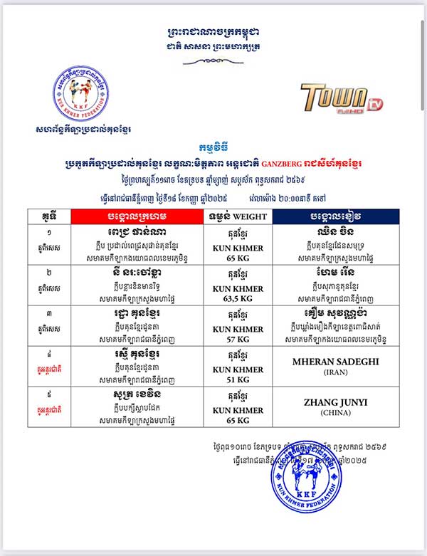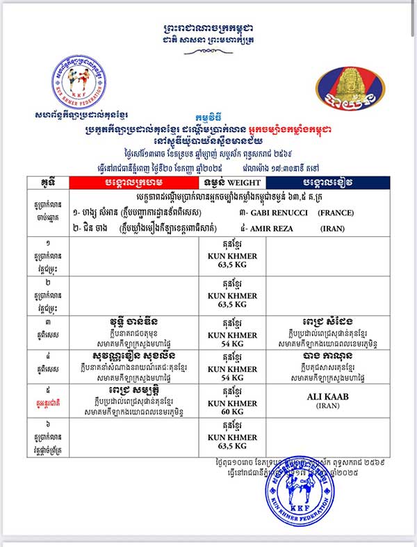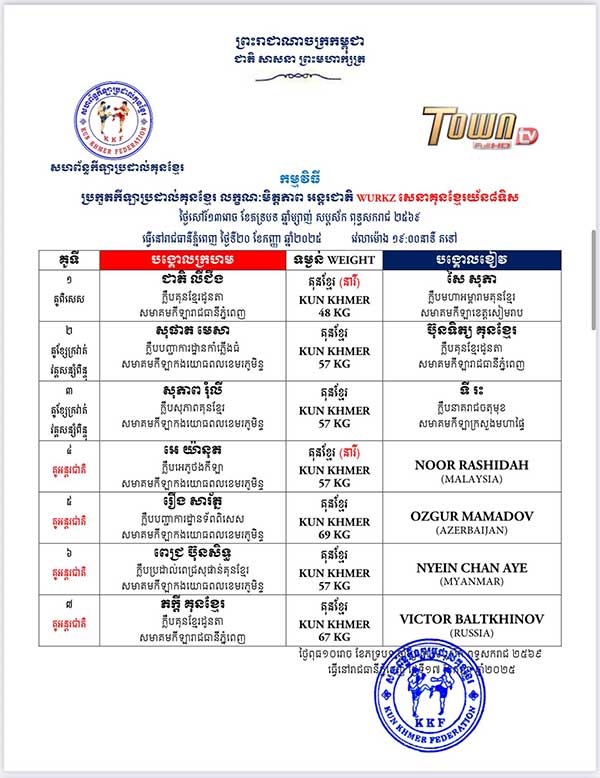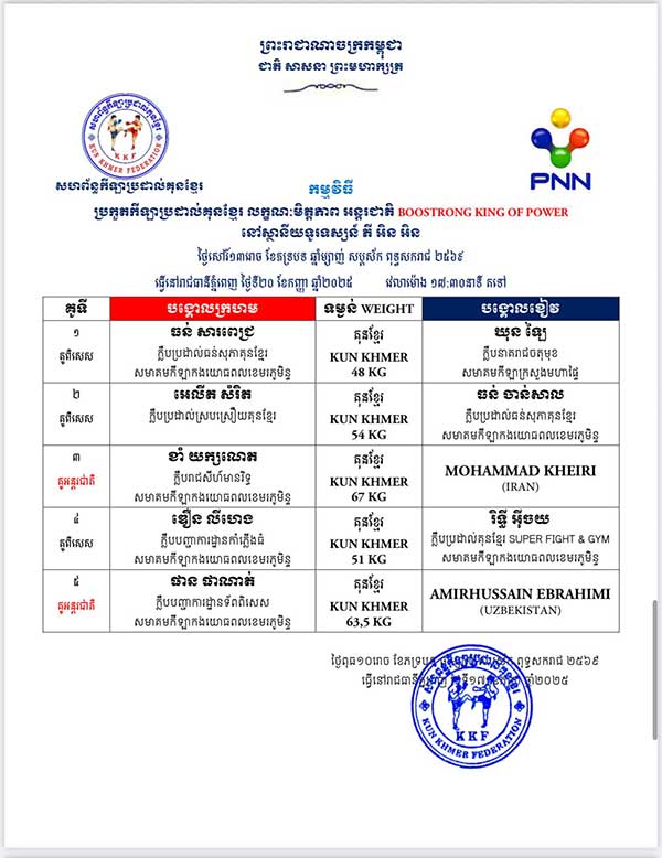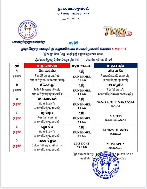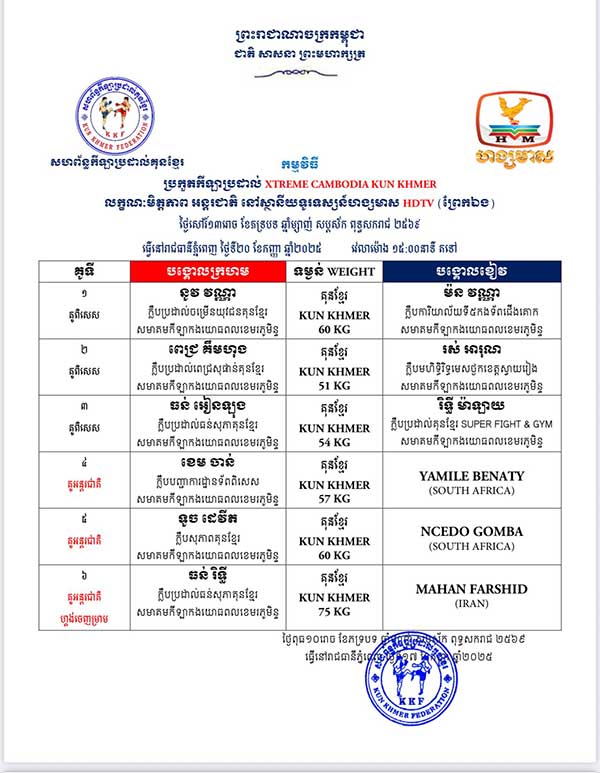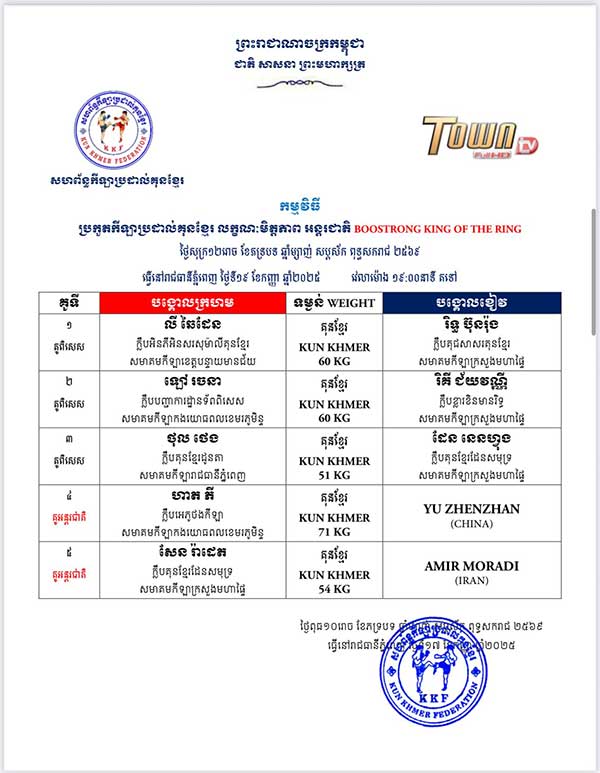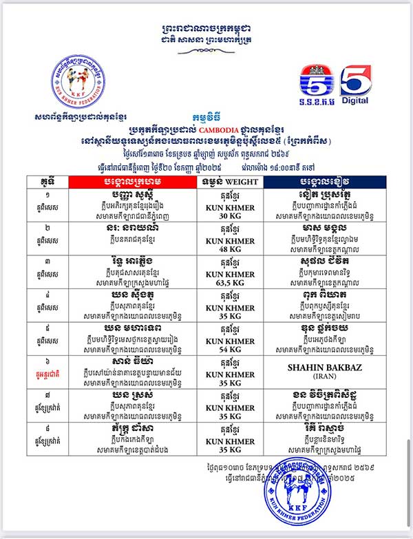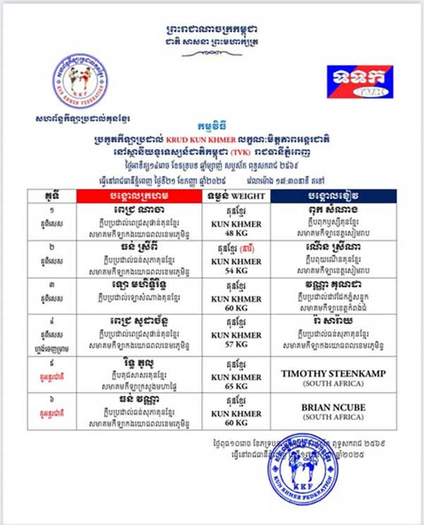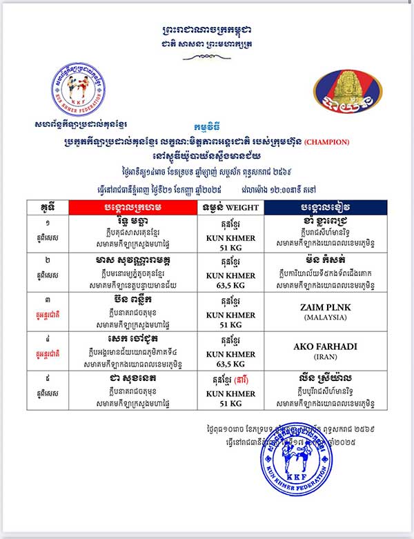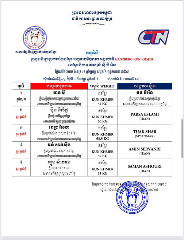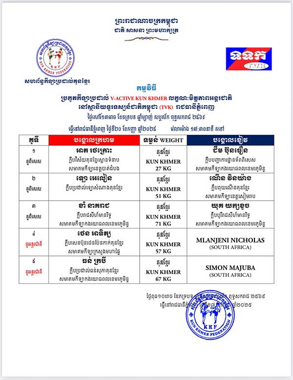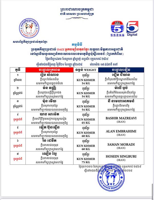 កម្មវិធីប្រកួតកីឡាប្រដាល់គុនខ្មែរ គូមិត្តភាពជាតិអន្តរជាតិនិងដណ្ដើមខ្សែក្រវាត់តាមស្ថានីយនានា ចាប់ពីថ្ងៃទី១៨ទី១៩ទី២០ទី២១ខែ កញ្ញាឆ្នាំ២០២៥។