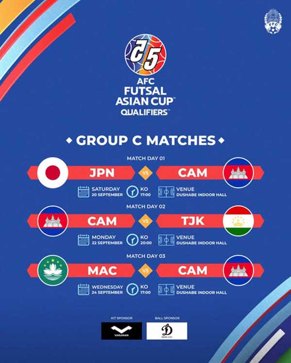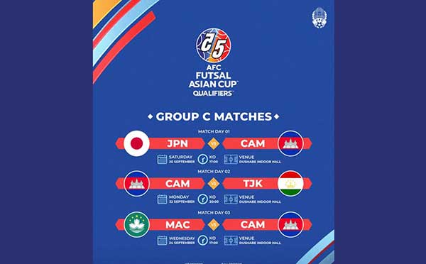 កាលវិភាគការប្រកួតរបស់ក្រុមជម្រើសជាតិហ្វូតសាលកម្ពុជា ក្នុងវគ្គជម្រុះពានរង្វាន់ AFC Futsal Asian Cup 2026 Qualifiers ដែលនឹងប្រព្រឹត្តទៅចាប់ពីថ្ងៃទី២០ ដល់ថ្ងៃទី២៤ ខែកញ្ញា ឆ្នាំ២០២៥ នៅប្រទេស តាជីគីស្ថាន។