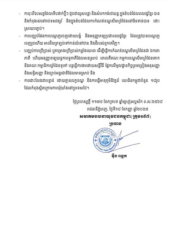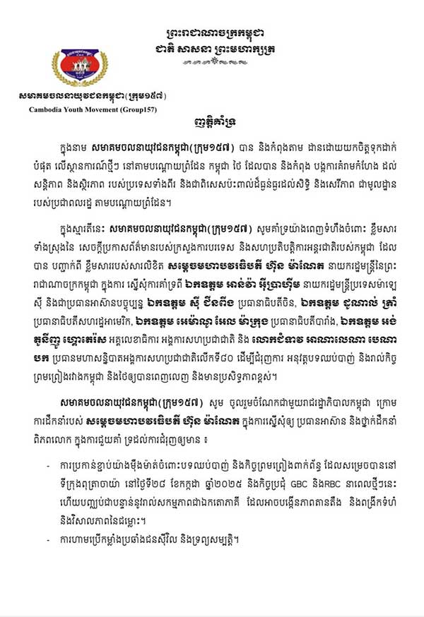 ញត្តិគាំទ្ររបស់សមាគមចលនាយុវជនកម្ពុជា(ក្រុម១៥៧) ចូលរួមចំណែកជាមួយរាជរដ្ឋាភិបាល ក្រោមការដឹកនាំរបស់សម្តេចមហាបវរធិបតី ហ៊ុន ម៉ាណែត ក្នុងការស្នើសុំឱ្យប្រធានអាស៊ាន និងថ្នាក់ដឹកនាំពិភពលោក ដើម្បីជួយគាំទ្រ និងជំរុញការអនុវត្តបទឈប់បាញ់ និងរាល់កិច្ចព្រមព្រៀងរវាងកម្ពុជា និងថៃឱ្យបានពេញលេញ និងមានប្រសិទ្ធភាពខ្ពស់
