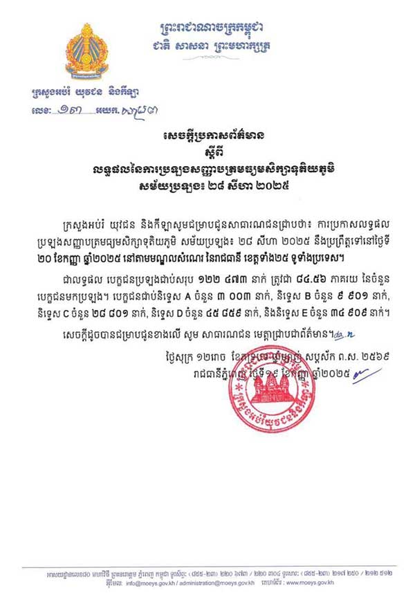 ក្រសួងអប់រំ យុវជន និងកីឡា ប្រកាសថាការប្រឡងសញ្ញាបត្រមធ្យមសិក្សាទុតិយភូមិ (បាក់ឌុប) សម័យប្រឡង ២៨ សីហា ២០២៥ មានបេក្ខជនប្រឡងជាប់សរុប ១២២ ៤៧៣នាក់ ត្រូវជា៨៤.៥៦ភាគរយ នៃចំនួនបេក្ខជនមកប្រឡង ក្នុងនោះនិទ្ទេស A មានចំនួន ៣ ០០៣នាក់៕