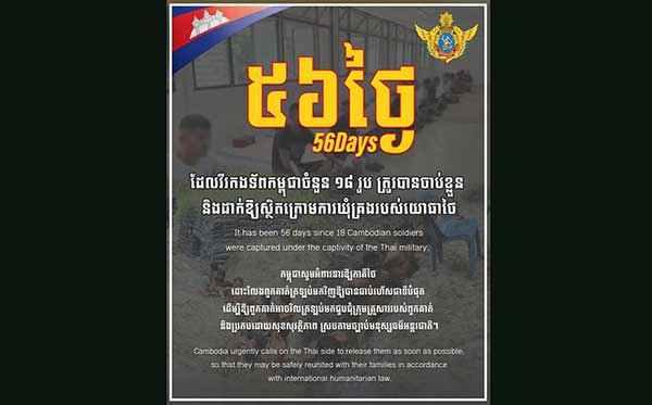 It has been 56days since 18 Cambodian soldiers were captured under the captivity of the Thai military. Cambodia urgently calls on the Thai side to release them as soon as possible, so that they may be safely reunited with their families in accordance with international humanitarian law.