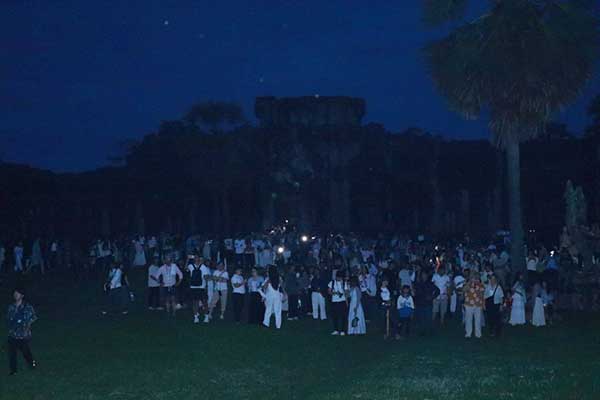 ទិដ្ឋភាពថ្ងៃរះពេលព្រឹកព្រលឹមនៃព្រឹត្តិការណ៍សមរាត្រី មានភ្ញៀវទេសចរជាតិ-អន្តរជាតិជាច្រើនកុះករ បានមកទស្សនានិងផ្តិតយករូបភាពដ៏អស្ចារ្យនៅប្រាសាទអង្គរ