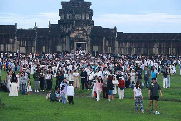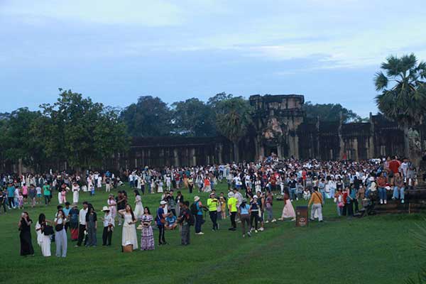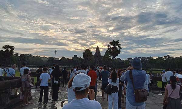 ទិដ្ឋភាពថ្ងៃរះពេលព្រឹកព្រលឹមថ្ងៃទី២១ ខែកញ្ញា ឆ្នាំ២០២៥ ត្រូវនឹងថ្ងៃព្រឹត្តិការណ៍សមរាត្រី មានភ្ញៀវទេសចរជាតិ-អន្តរជាតិជាច្រើនកុះករ បានមកទស្សនា និងផ្តិតយករូបភាពដ៏អស្ចារ្យនៅប្រាសាទអង្គរ។