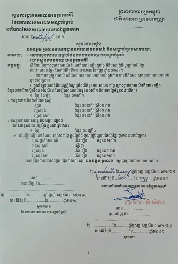 យោងតាមរបាយការណ៍របស់ការិយាល័យនៃស្នងការដ្ឋាននគរបាលខេត្តរតនគិរី បានបង្ហាញថា ក្នុងឱកាសពិធីបុណ្យភ្ជុំបិណ្ឌប្រពៃណីខ្មែរ រយៈពេល៣ថ្ងៃ ចាប់ពីថ្ងៃទី២១រហូតដល់ថ្ងៃទី២៣ ខែកញ្ញា ឆ្នាំ២០២៥ ករណីគ្រោះថ្នាក់ចរាចរណ៍បានកើតឡើង រវាងម៉ូតូនិងម៉ូតូចំនួន២លើក (មនុស្សស្លាប់គ្មាន) និងរបួសធ្ងន់ចំនួន៤នាក់/ស្រី១នាក់របួសស្រាលចំនួន១នាក់។