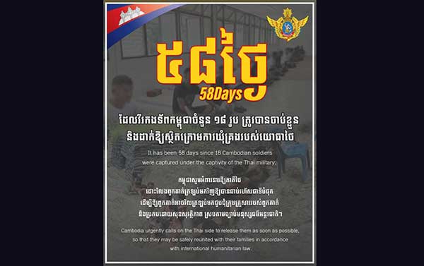 It has been 58days since 18 Cambodian soldiers were captured under the captivity of the Thai military. Cambodia urgently calls on the Thai side to release them as soon as possible, so that they may be safely reunited with their families in accordance with international humanitarian law.