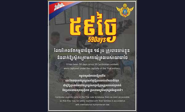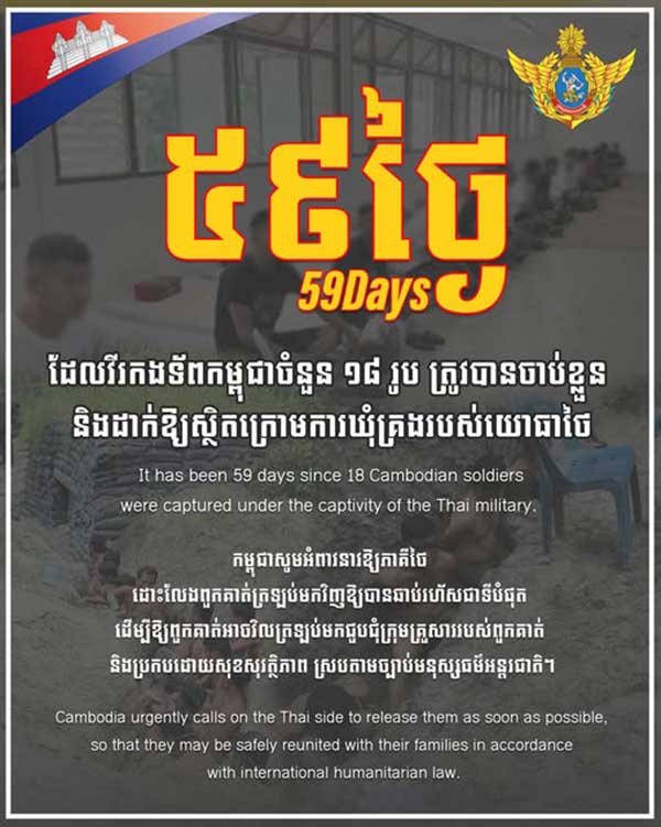 It has been 59days since 18 Cambodian soldiers were captured under the captivity of the Thai military. Cambodia urgently calls on the Thai side to release them as soon as possible, so that they may be safely reunited with their families in accordance with international humanitarian law.