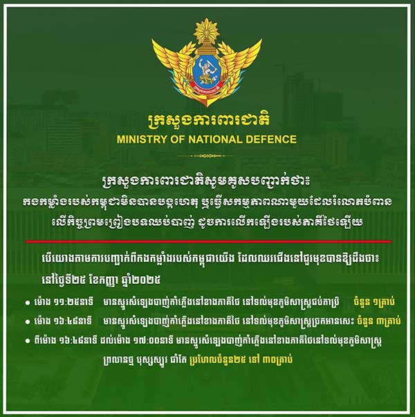 ក្រសួងការពារជាតិនៃព្រះរាជាណាចក្រកម្ពុជាបានចេញសេចក្តីប្រកាសព័ត៌មានមួយដោយជម្រាបជូនព័ត៌មានដល់សាធារណជនជាតិ និងអន្តរ ជាតិមេត្តាជ្រាបថា៖ នៅថ្ងៃទី២៥ ខែកញ្ញា ឆ្នាំ២០២៥ មានផេកផ្លូវការរបស់មជ្ឈមណ្ឌលប្រតិបត្តការតំបន់កងទ័ពទី២របស់ថៃ  និងសារព័ត៌មានរបស់ថៃមួយចំនួនបានចុះផ្សាយនាល្ងាចនេះម្តងទៀតថា “កម្ពុជាបានបង្កហេតុដោយមានសកម្មភាពចល័តរថក្រោះចូលនិងឮសម្លេងកាំភ្លើង ឮសម្លេងផ្ទុះគ្រាប់បែក និងរកឃើញការចូលជិតលួសបន្លា ព្រមទាំងមានការបាញ់ចូល ដើម្បីពិនិត្យមើលរយៈចម្ងាយ ជាដើម។