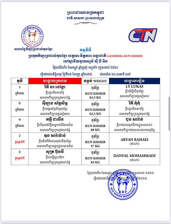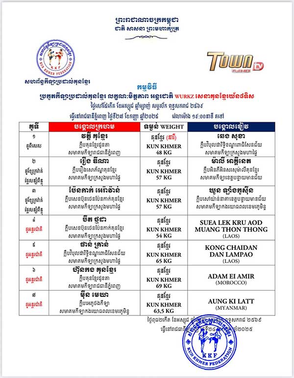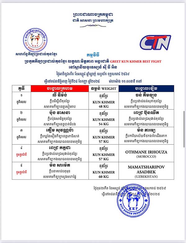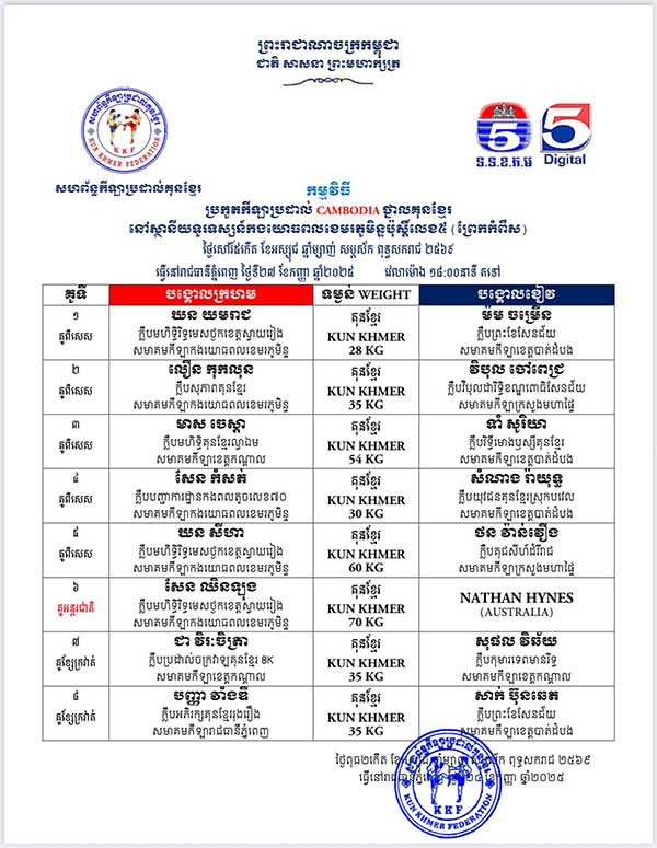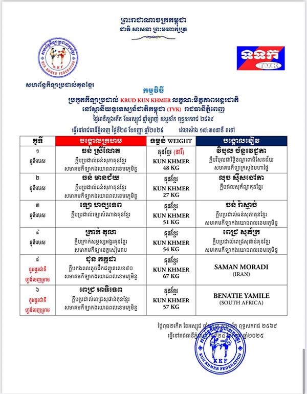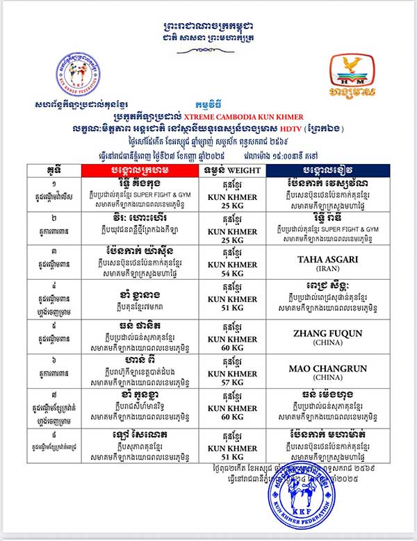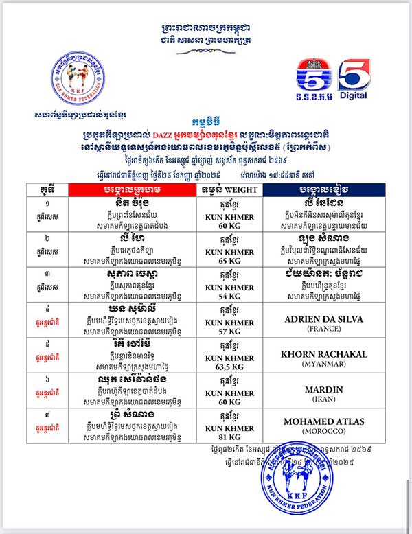 កម្មវិធីប្រកួតកីឡាប្រដាល់គុនខ្មែរ គូមិត្តភាពជាតិអន្តរជាតិនិងដណ្ដើមខ្សែ ក្រវាត់តាមស្ថានីយនានាចាប់ពីថ្ងៃទី២៥ ទី២៦ ទី២៧ ទី២៨ ខែ កញ្ញាឆ្នាំ២០២៥។