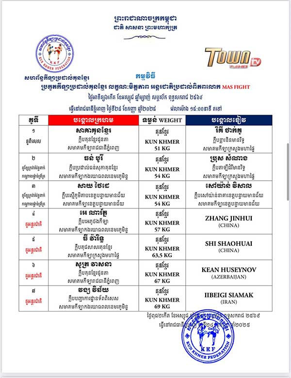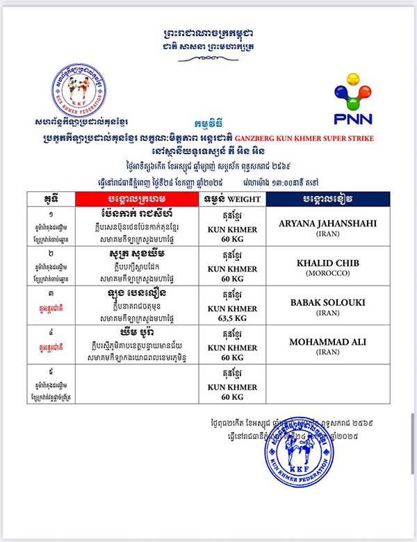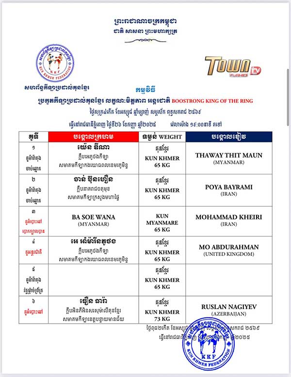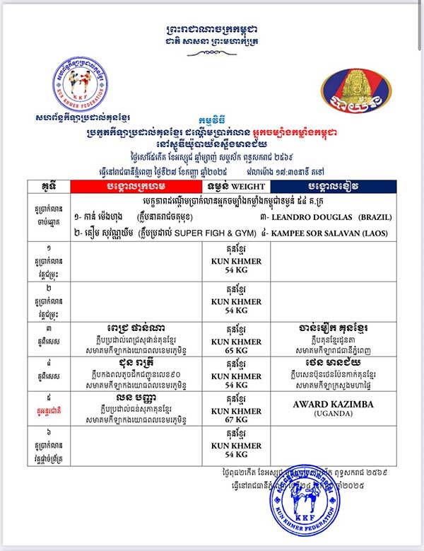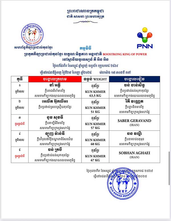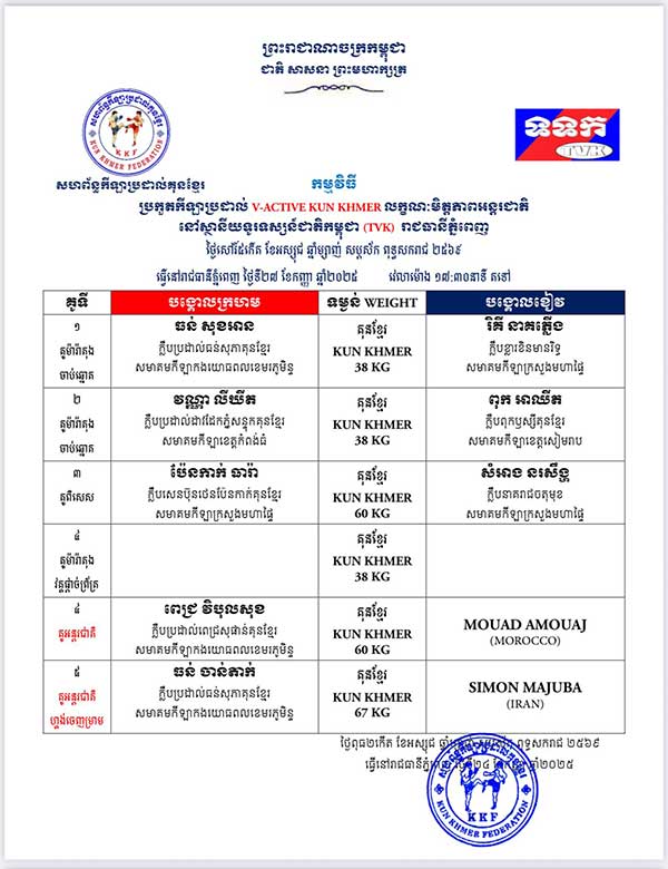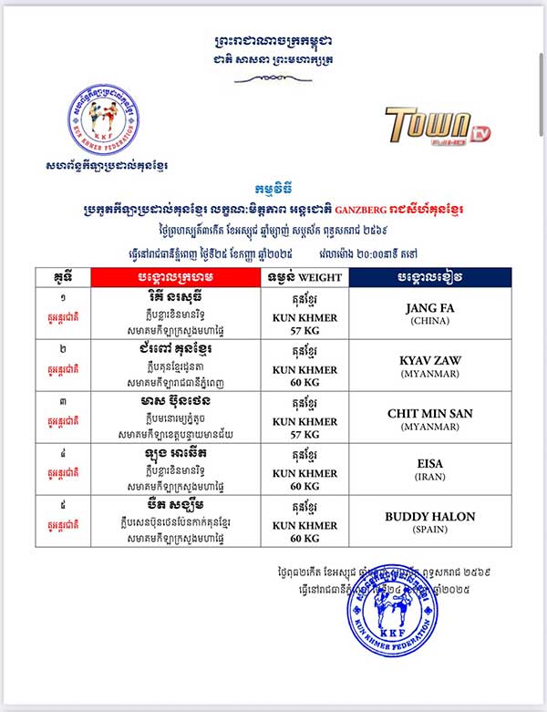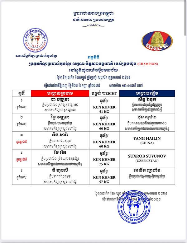 កម្មវិធីប្រកួតកីឡាប្រដាល់គុនខ្មែរ គូមិត្តភាពជាតិអន្តរជាតិនិងដណ្ដើមខ្សែ ក្រវាត់តាមស្ថានីយនានាចាប់ពីថ្ងៃទី២៥ ទី២៦ ទី២៧ ទី២៨ ខែ កញ្ញាឆ្នាំ២០២៥។
