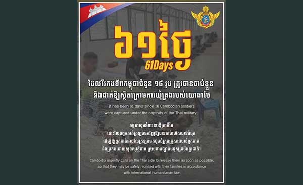 It has been 61days since 18 Cambodian soldiers were captured under the captivity of the Thai military. Cambodia urgently calls on the Thai side to release them as soon as possible, so that they may be safely reunited with their families in accordance with international humanitarian law.
