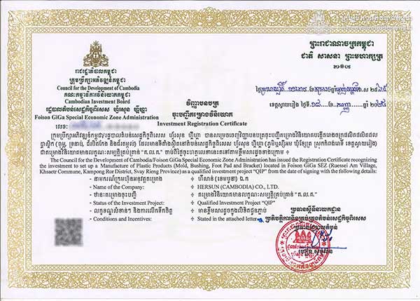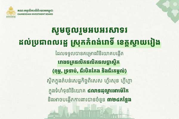 សូមចូលរួមអបអរសាទរដល់ប្រជាពលរដ្ឋស្រុកកំពង់រោទិ៍ ខេត្តស្វាយរៀង ដែលទទួលបានគម្រោងវិនិយោគបង្កើតរោងចក្រផលិតផលិតផលប្លាស្ទិក (ពុម្ព, ទ្រនាប់, ជ័របិតកែង និងជ័រតម្កល់) ស្ថិតក្នុងតំបន់សេដ្ឋកិច្ចពិសេស ហ័្វរសុន ហ្គីហ្គា ក្នុងទំហំទុនវិនិយោគ ៤លានដុល្លារអាម៉េរិក និងអាចបង្កើតការងារបានចំនួន ៣២៤កន្លែង។