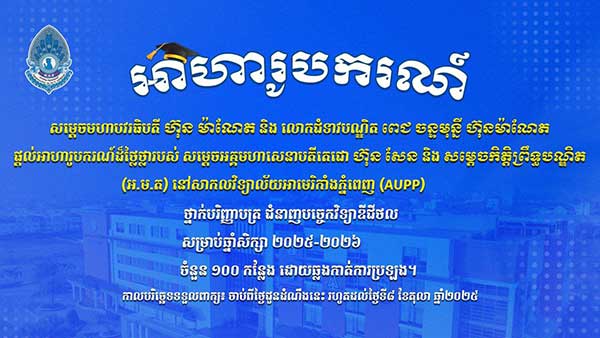 (ភ្នំពេញ)៖ សម្តេចមហាបវរធិបតី ហ៊ុន ម៉ាណែត នាយករដ្ឋមន្ដ្រីនៃកម្ពុជា និងលោកជំទាវបណ្ឌិត ពេជ ចន្ទមុន្នី ហ៊ុនម៉ាណែត ផ្តល់អាហារូបករណ៍ដ៏ថ្លៃថ្លារបស់សម្តេចអគ្គមហាសេនាបតីតេជោ ហ៊ុន សែន និងសម្តេចកិត្តិព្រឹទ្ធបណ្ឌិត (អ.ម.ត) នៅសាកលវិទ្យាល័យអាមេរិកាំងភ្នំពេញ (AUPP) ថ្នាក់បរិញ្ញាបត្រ ជំនាញបច្ចេកវិទ្យាឌីជីថល សម្រាប់ឆ្នាំសិក្សា២០២៥-២០២៦ ចំនួន១០០កន្លែង ដោយឆ្លងកាត់ការប្រឡង។