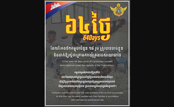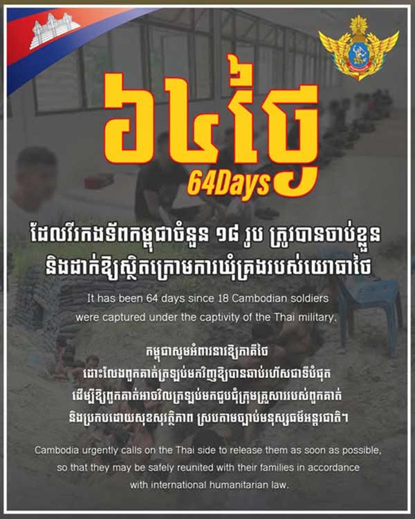 It has been 64days since 18 Cambodian soldiers were captured under the captivity of the Thai military. Cambodia urgently calls on the Thai side to release them as soon as possible, so that they may be safely reunited with their families in accordance with international humanitarian law.