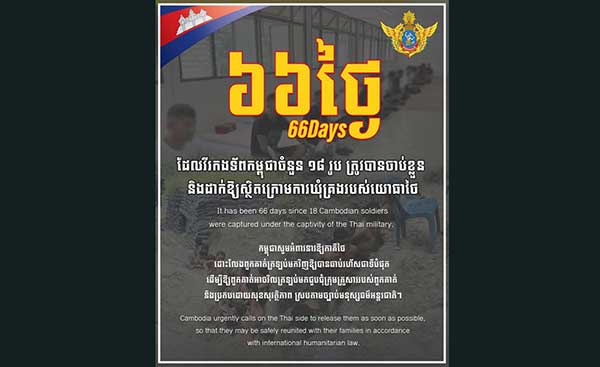 It has been 66days since 18 Cambodian soldiers were captured under the captivity of the Thai military. Cambodia urgently calls on the Thai side to release them as soon as possible, so that they may be safely reunited with their families in accordance with international humanitarian law.