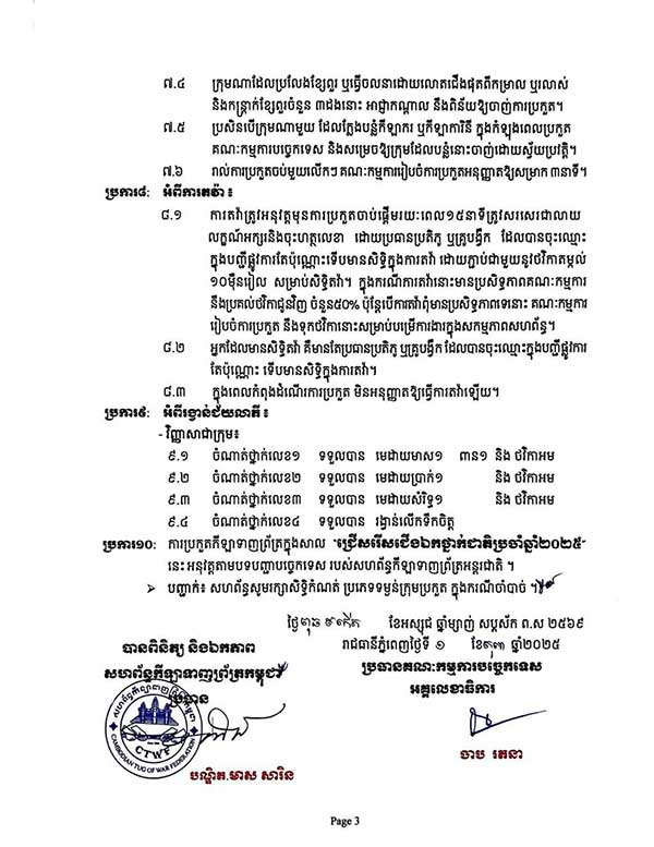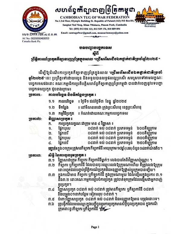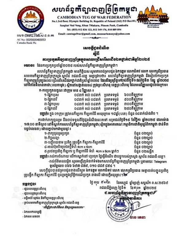 សហព័ន្ធកីឡាទាញព្រ័ត្រកម្ពុជា នឹងរៀបចំការប្រកួត កីឡាទាញព្រ័ត្រក្នុងសាល ជ្រើសរើសជើង ឯកថ្នាក់ជាតិប្រចាំឆ្នាំ២០២៥ ដែលនឹងប្រព្រឹត្តទៅចាប់ពីថ្ងៃទី១ ដល់ថ្ងៃទី៣ ខែធ្នូ ឆ្នាំ២០២៥ នៅទីតាំងទីលាន់តេជោ(ពយតាមូង) ស្ថិតនៅសង្កាត់លេខ៤ ក្រុងព្រះសីហនុ ខេត្តព្រះសីហនុ៕
