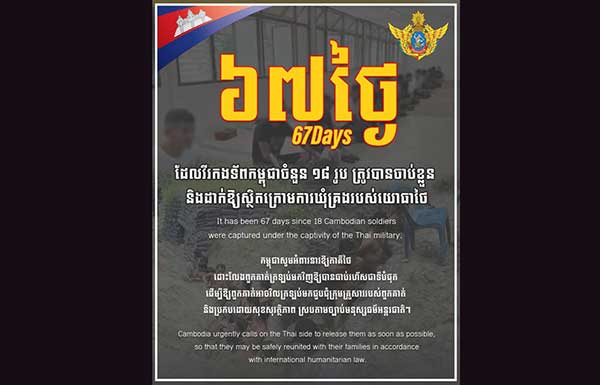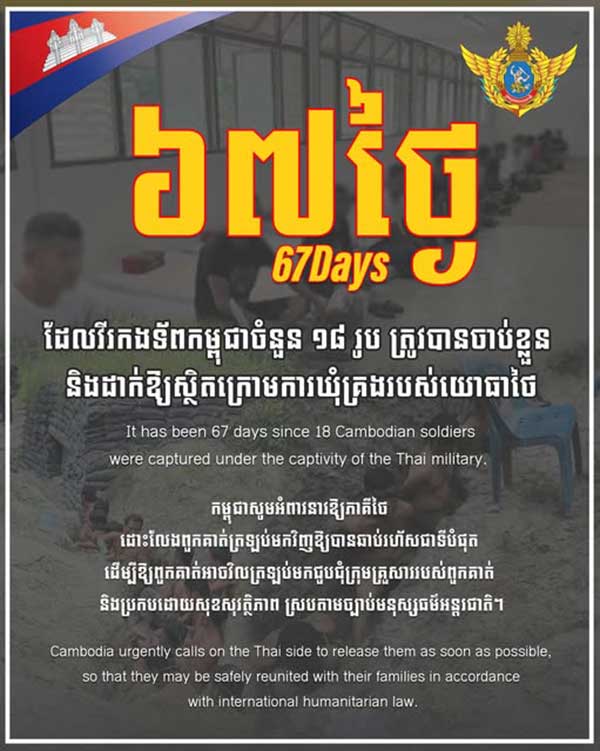 It has been 67days since 18 Cambodian soldiers were captured under the captivity of the Thai military. Cambodia urgently calls on the Thai side to release them as soon as possible, so that they may be safely reunited with their families in accordance with international humanitarian law.