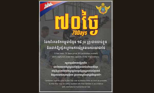 It has been 70days since 18 Cambodian soldiers were captured under the captivity of the Thai military. Cambodia urgently calls on the Thai side to release them as soon as possible, so that they may be safely reunited with their families in accordance with international humanitarian law.
