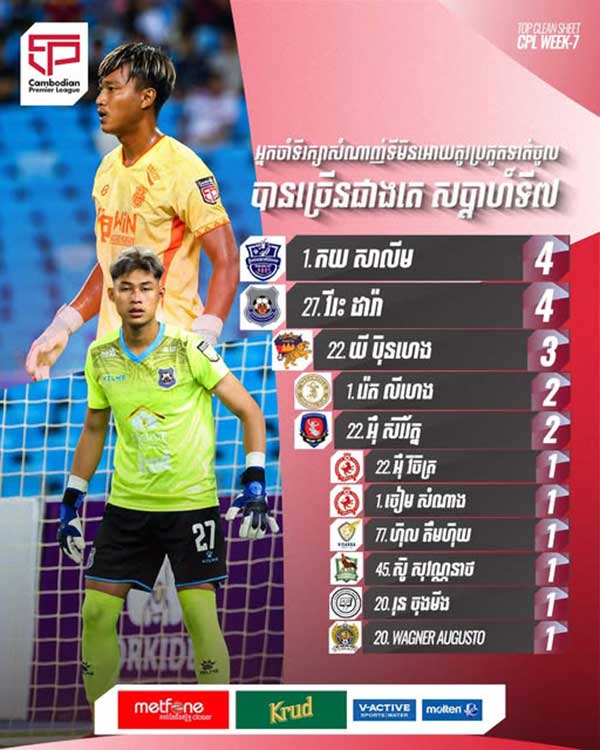 គិតត្រឹមសប្ដាហ៍ទី៧ អ្នកចាំទីក្រុមនាគខៀវបឹងកេត កយ សាលីម និង វិរៈ ដារ៉ា អ្នកចាំទីក្រុមព្រះខ័នរាជស្វាយរៀង បានរក្សា Clean-Sheets ចំនួន៤ស្មើគ្នា ខណៈអ្នកចាំទីណាហ្គា សារ៉េ លីហេង រក្សាសំណាញ់ទីចំនួន២ និងអ្នកចាំទីអង្គរថាយហ្គឺ យី ប៊ុនហេង រក្សាសំណាញ់ទីចំនួន៣៕