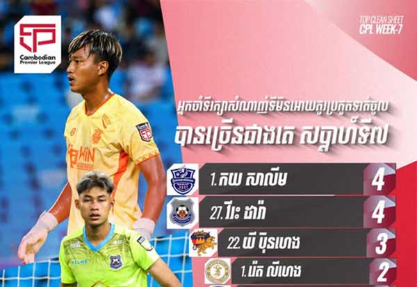 អ្នកចាំទីក្រុមនាគខៀវបឹងកេត កយ សាលីម និង វិរៈ ដារ៉ា អ្នកចាំទីក្រុមព្រះខ័នរាជស្វាយរៀង បានបន្តឈរកំពូលតារាង Clean-Sheets ជាបណ្ដោះអាសន្នដដែល នៅក្នុងការប្រកួតជម្រើសជើងឯកខេមបូឌានព្រីមៀរលីគ ឆ្នាំ២០២៥/២៦ គិតត្រឹមសប្ដាហ៍ទី៧។