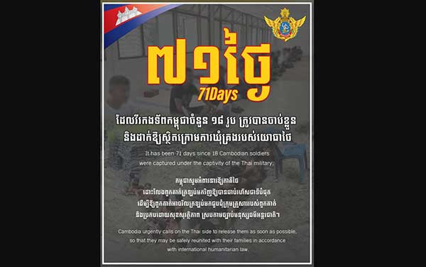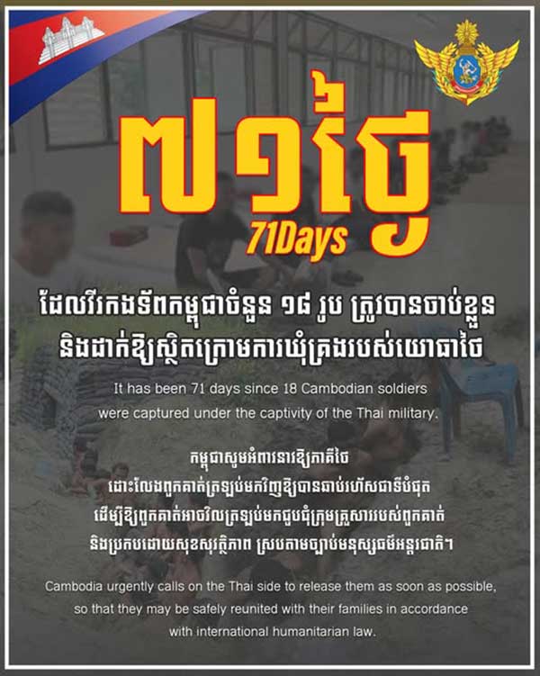 It has been 71days since 18 Cambodian soldiers were captured under the captivity of the Thai military. Cambodia urgently calls on the Thai side to release them as soon as possible, so that they may be safely reunited with their families in accordance with international humanitarian law.