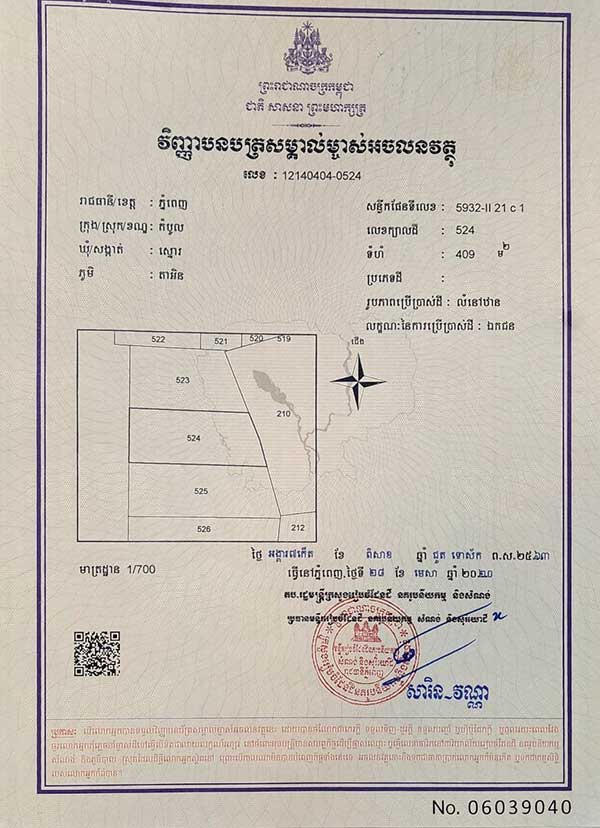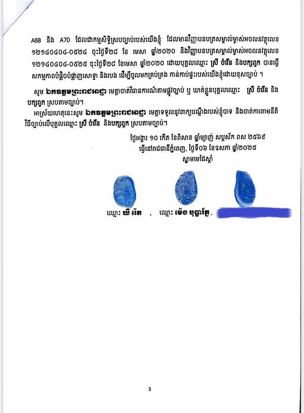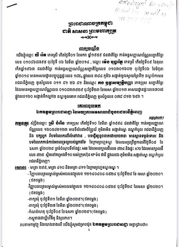 យោងតាមពាក្យបណ្តឹង លោកស្រី ឃី រ៉េត និងលោកស្រី ម៉េង បុប្ជារ័ត្ន បានទិញអចលវត្ថុមួយកន្លែងផ្ទះលេខ៖ A68 នៅភូមិតាអិន សង្កាត់ស្ងោរ គម្រោងទី១០ ក្នុងខណ្ឌកំបូល ពីក្រុមហ៊ុន បុរី KP ម៉ន ដានី និងបានទទួលវិញ្ញាបនបត្រសម្គាល់ម្ចាស់អចលនវត្ថុលេខ៖ ១២១៤០៤០៤-០៥២៤ ចុះថ្ងៃទី២៨ ខែមេសា ឆ្នាំ២០២០។