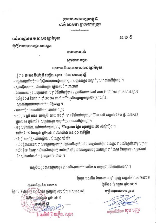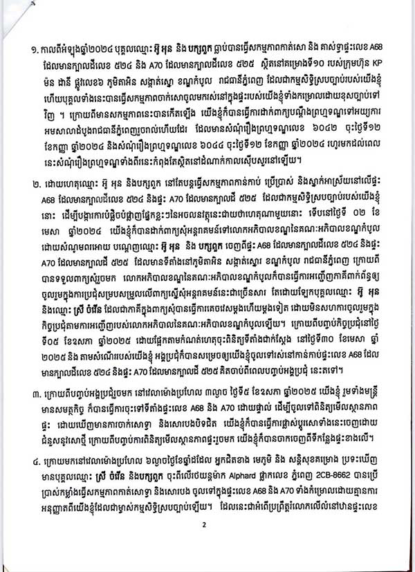 តាមការរៀបរាប់ក្នុងបណ្តឹងរបស់ម្ចាស់ផ្ទះខាងលើបានឱ្យដឹងថា ឈ្មោះ ស្រី ចំរើន និងបក្សពួក បានលួចកាត់សោចូលទៅនៅក្នុងផ្ទះរបស់ពួកគាត់ម្តងជាពីរដង ហើយក្រោយម្តងទៀតនៅថ្ងៃទី៥ ខែឧសភា ឆ្នាំ២០២៥។
