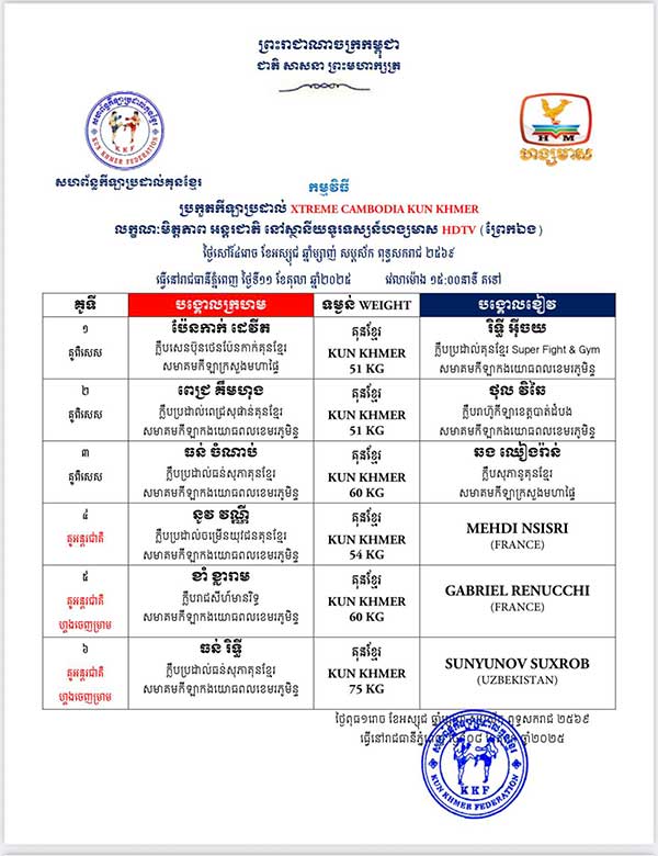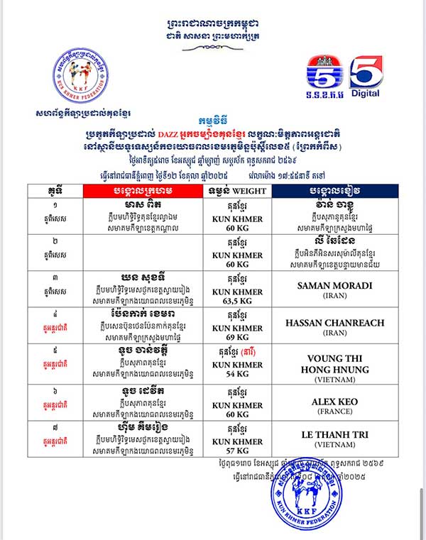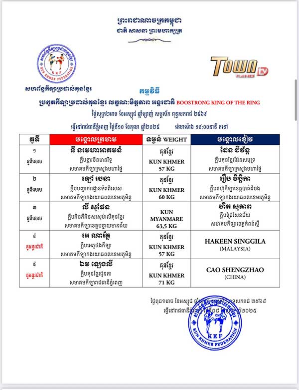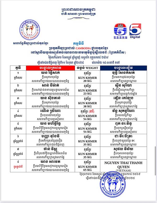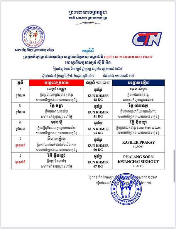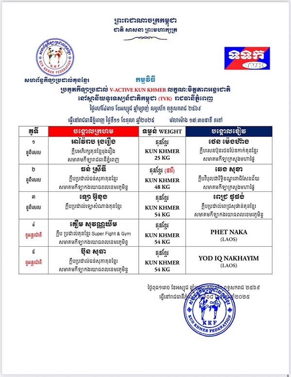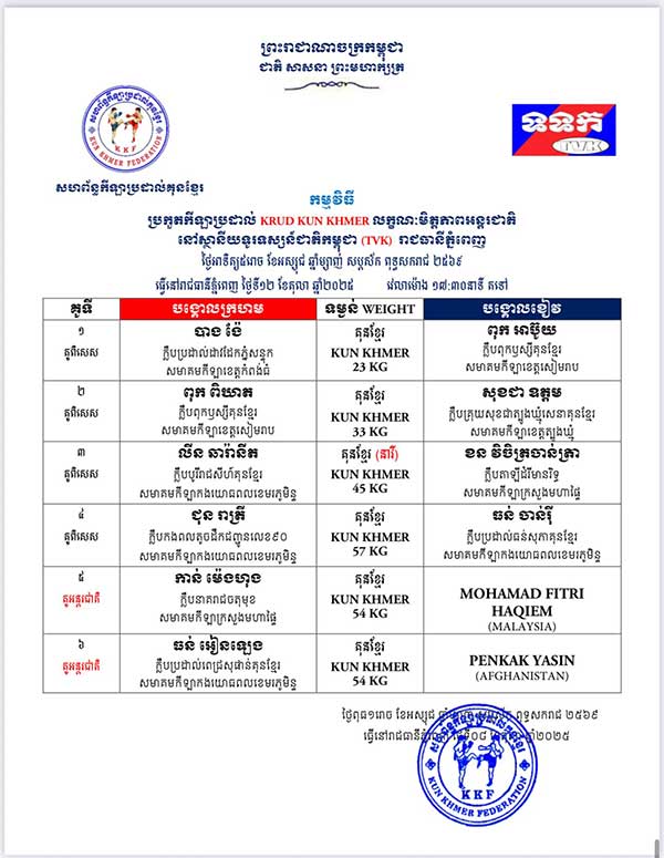 កម្មវិធីប្រកួតកីឡាប្រដាល់គុនខ្មែរ គូមិត្តភាពជាតិអន្តរជាតិនិងដណ្ដើមខ្សែក្រវាត់តាមស្ថានីយនានា សម្រាប់ថ្ងៃទី១០ទី១១ទី១២ខែ តុលា ឆ្នាំ២០២៥។