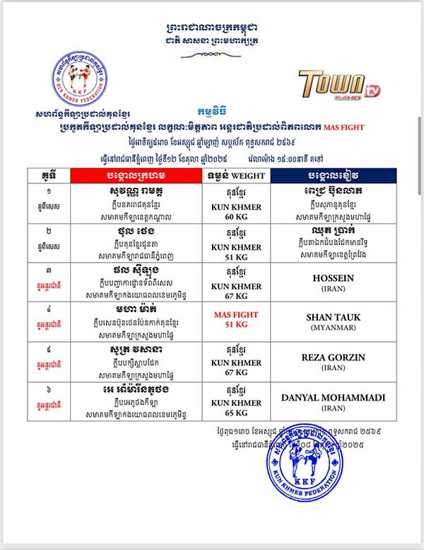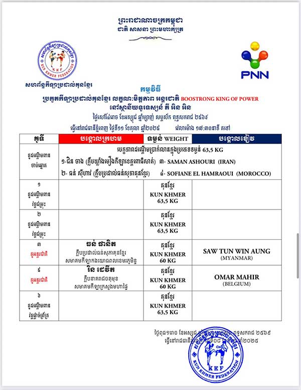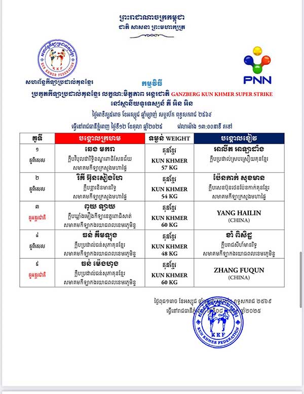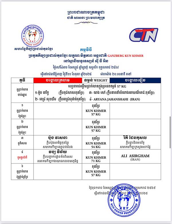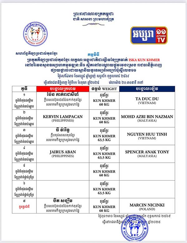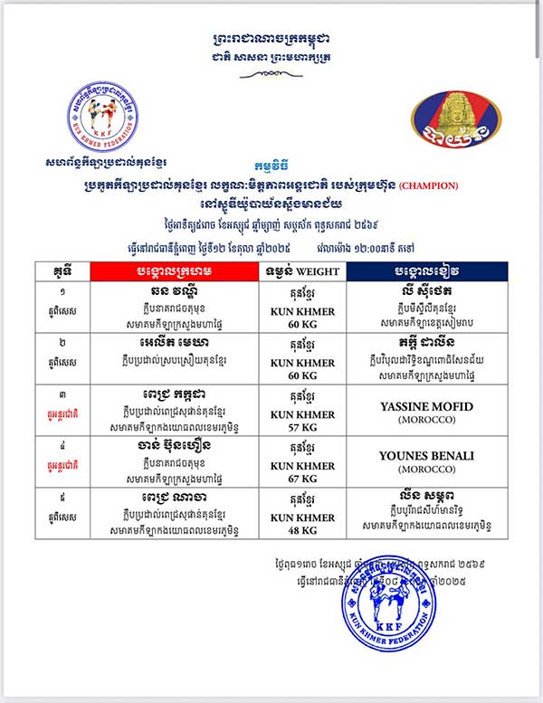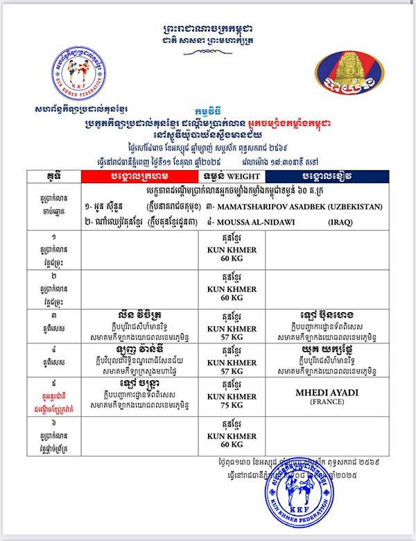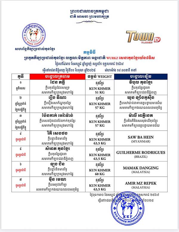 កម្មវិធីប្រកួតកីឡាប្រដាល់គុនខ្មែរ គូមិត្តភាពជាតិអន្តរជាតិនិងដណ្ដើមខ្សែក្រវាត់តាមស្ថានីយនានា សម្រាប់ថ្ងៃទី១០ទី១១ទី១២ខែ តុលា ឆ្នាំ២០២៥។