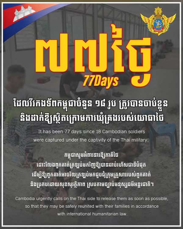 ថ្ងៃនេះជា ថ្ងៃទី៧៧ហើយ ដែលវីរកងទ័ពកម្ពុជាចំនួន ១៨រូប ត្រូវបានចាប់ខ្លួន និងដាក់ឱ្យស្ថិតក្រោមការឃុំគ្រងរបស់យោធាថៃ។