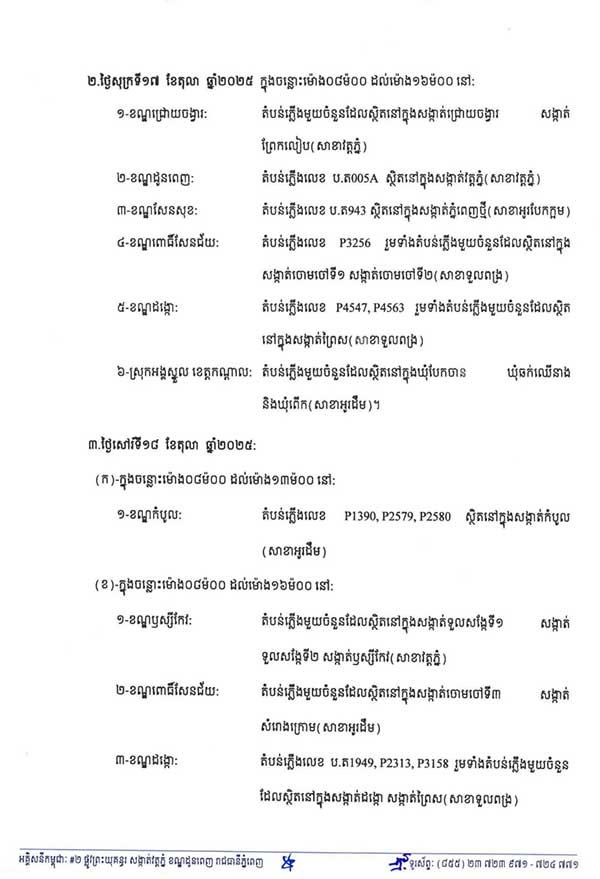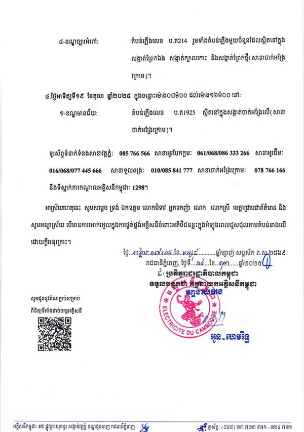 (ភ្នំពេញ)៖ អគ្គិសនីកម្ពុជា (EDC) បានចេញសេចក្តីជូនដំណឹង ស្តីពីការអនុវត្តការងារជួសជុល ផ្លាស់ប្តូរដំឡើងបរិក្ខារនានា និងរុះរើគន្លងខ្សែបណ្តាញ អគ្គិសនីរបស់អគ្គិសនីកម្ពុជា ដើម្បីបង្កលក្ខណៈងាយស្រួលដល់ការដ្ឋានពង្រីកផ្លូវ នៅថ្ងៃទី១៦ ខែតុលា ឆ្នាំ២០២៥ ដល់ថ្ងៃទី១៩ ខែតុលា ឆ្នាំ២០២៥ នៅតំបន់មួយចំនួនទៅតាមពេលវេលា និងទីកន្លែងដូចសេចក្តីជូនដំណឹងលម្អិតខាងក្រោម។