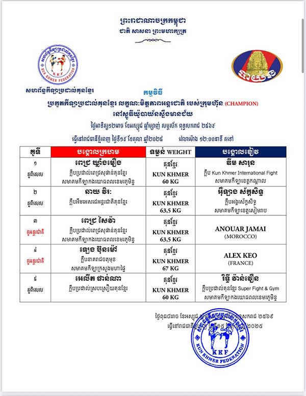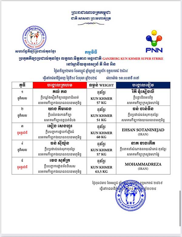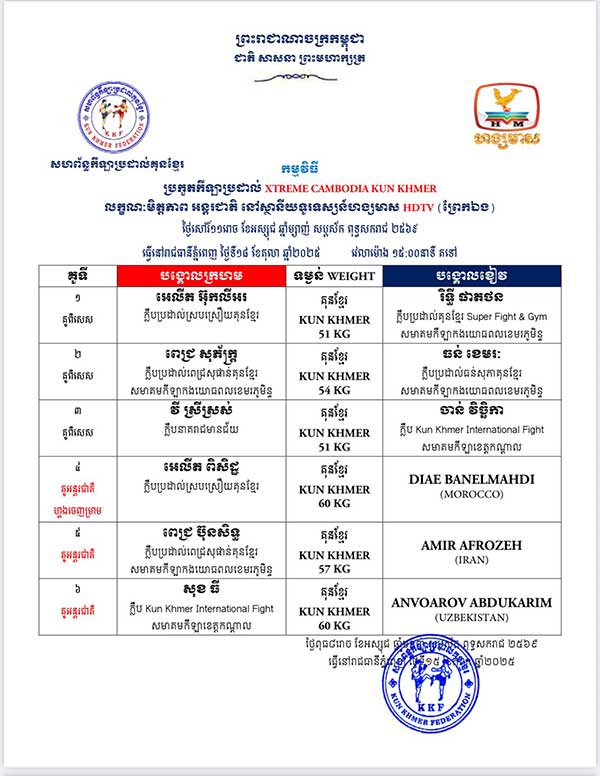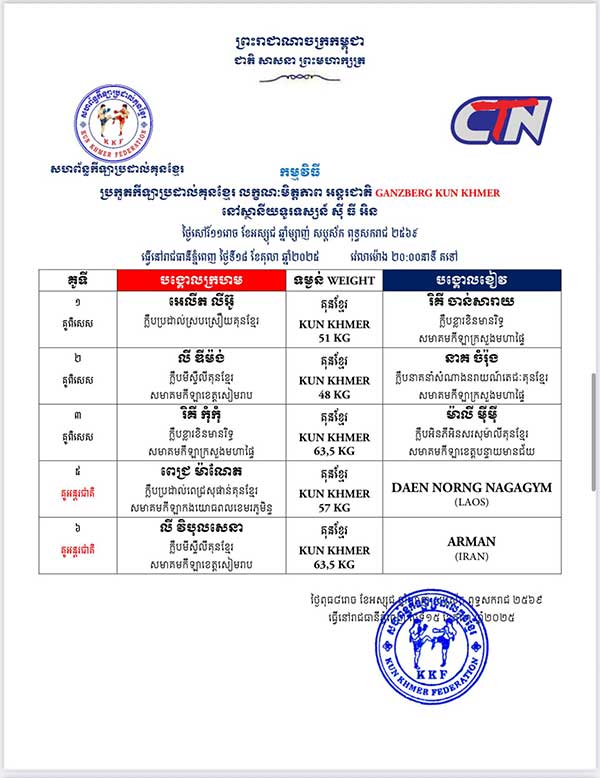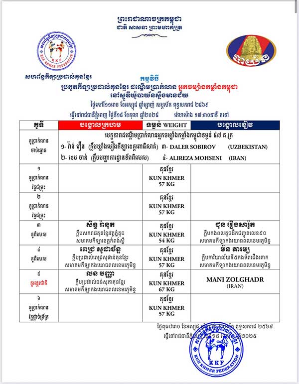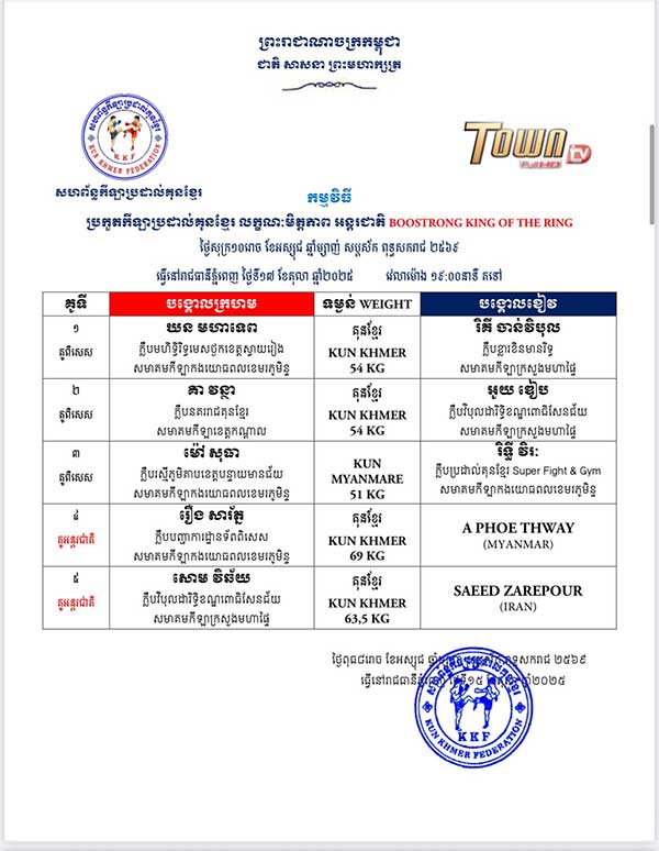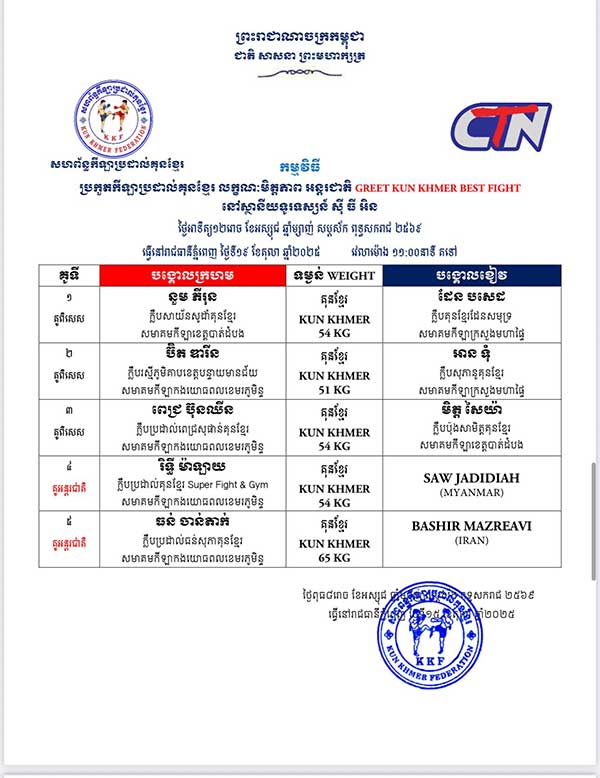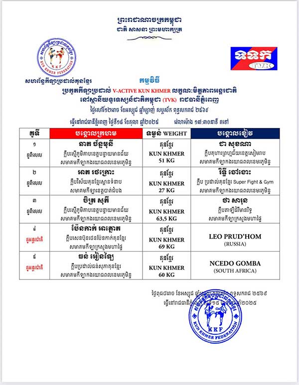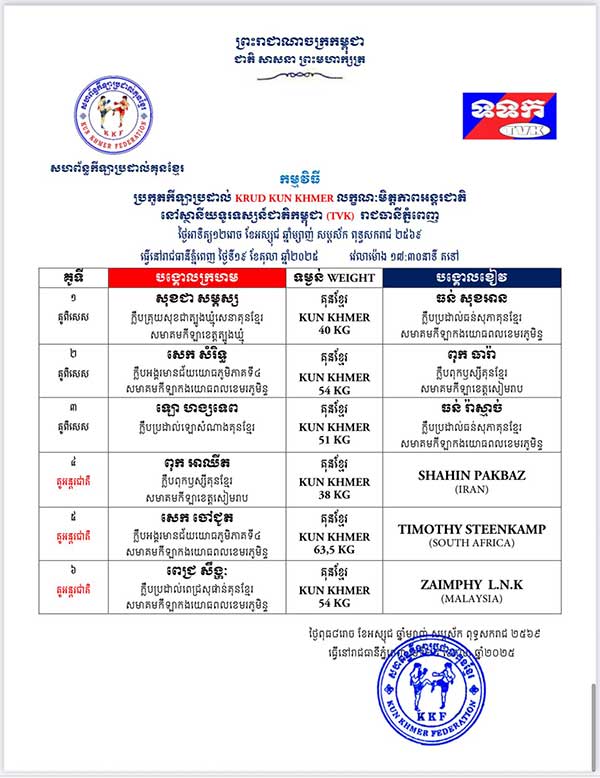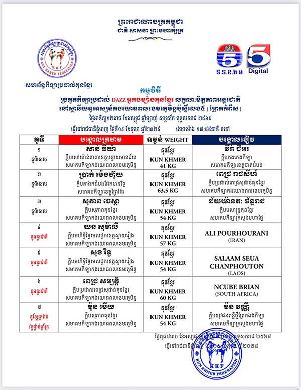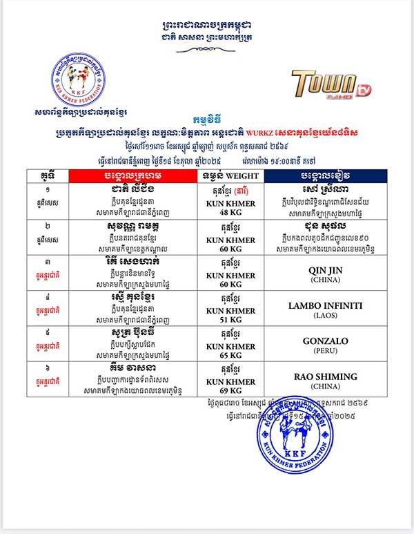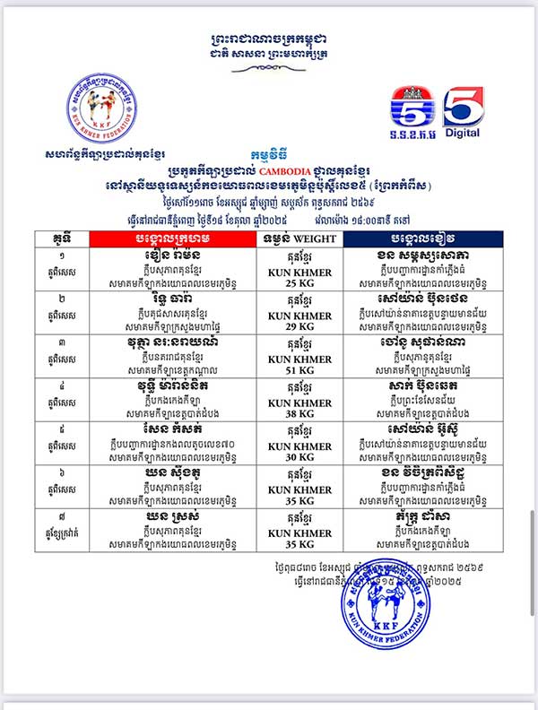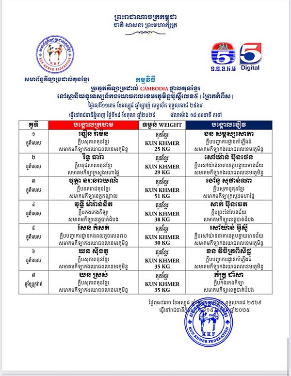 កម្មវិធីប្រកួតកីឡាប្រដាល់គុនខ្មែរ គូមិត្តភាពជាតិអន្តរជាតិនិងដណ្ដើមខ្សែ​ក្រវា​ត់​តាមស្ថានីយនានាចាប់ពីថ្ងៃទី១៦​ ទី១៧ ទី១៨ ទី១៩ ខែ  តុលា ឆ្នាំ២០២៥។