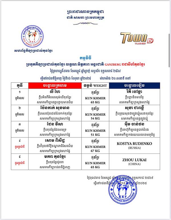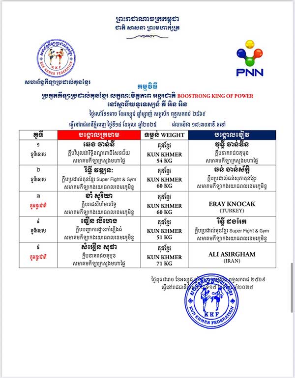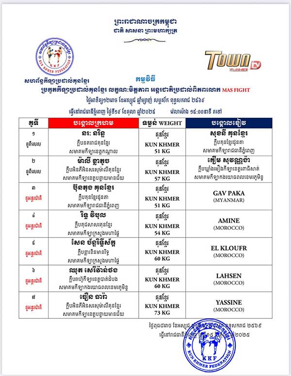 ​កម្មវិធីប្រកួត​ប្រដាល់គុនខ្មែរ គូមិត្តភាពជាតិអន្តរជាតិនិងដណ្ដើមខ្សែក្រវាត់តាមស្ថានីយនានា សម្រាប់ចុងសប្ដាហ៍