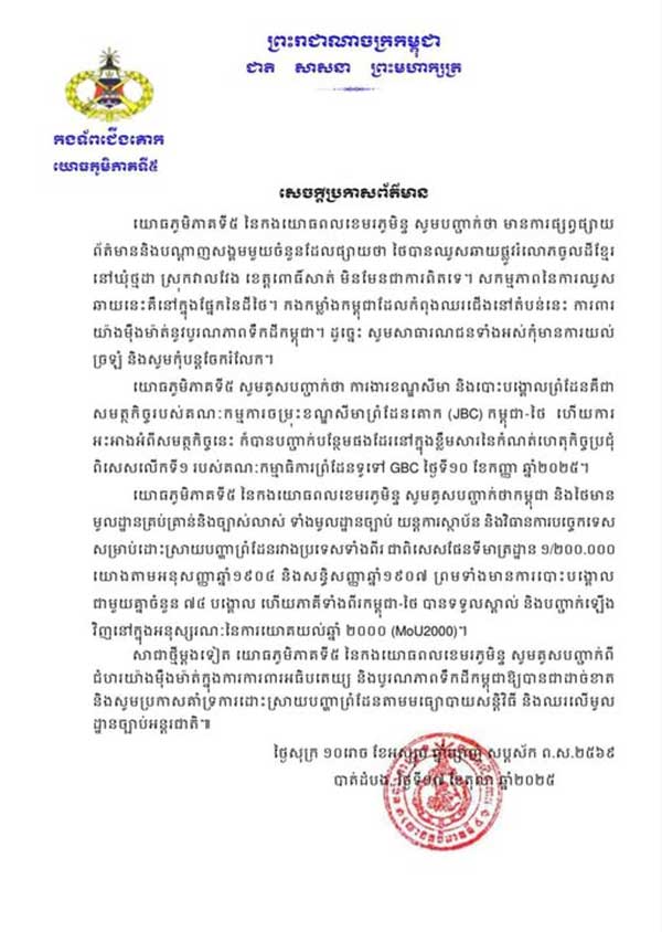 សេចក្តីប្រកាសព័ត៌មាន យោធភូមិភាគទី៥ នៃកងយោធពលខេមរភូមិន្ទ សូមបញ្ជាក់ថា មានការផ្សព្វផ្សាយព័ត៌មាន និងបណ្តាញសង្គមមួយចំនួនដែលបានផ្សាយថា «ថៃបានឈូសឆាយផ្លូវរំលោភចូលដីខ្មែរ នៅឃុំថ្មដា ស្រុកវាលវែង ខេត្តពោធិ៍សាត់ មិនមែនជាការពិតនោះទេ»(AKP)