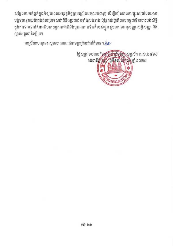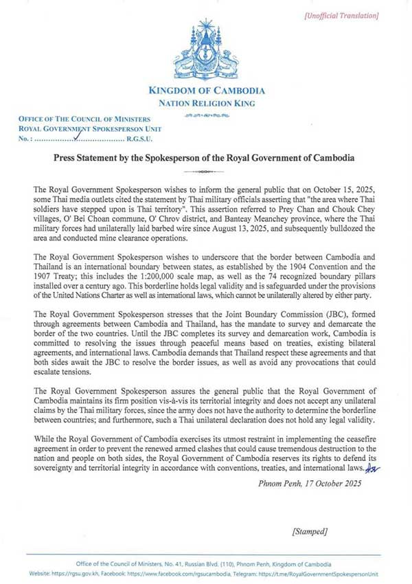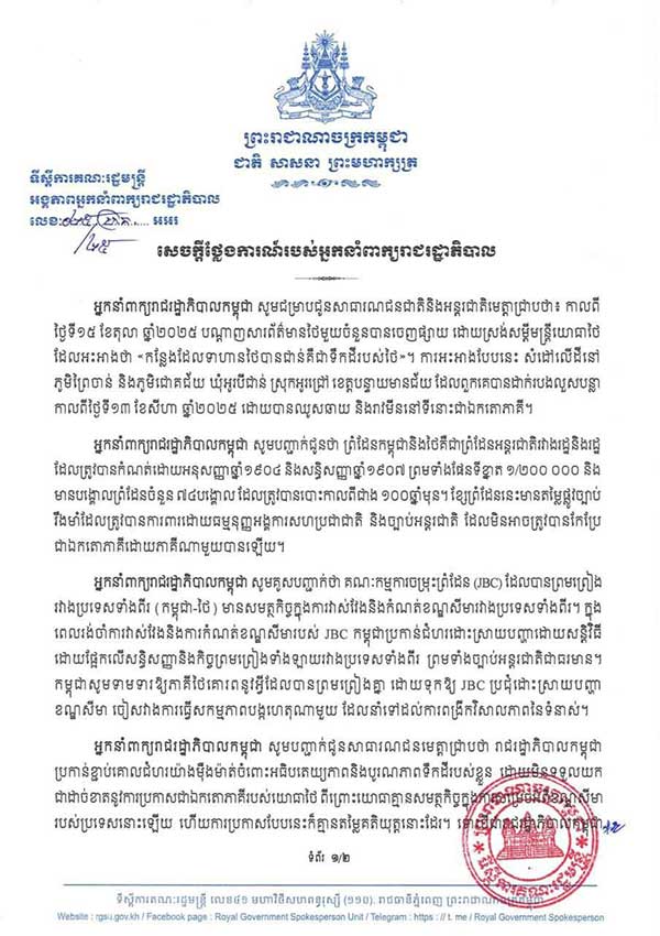 អ្នកនាំពាក្យរាជរដ្ឋាភិបាលកម្ពុជាបានចេញនូវសេចក្តីថ្លែងការណ៍ដោយបញ្ជាក់ថា រាជរដ្ឋាភិបាលកម្ពុជាប្រកាន់ខ្ជាប់គោលជំហរយ៉ាងម៉ឺងម៉ាត់ចំពោះអធិបតេយ្យភាពនិងបូរណភាពទឹកដីរបស់ខ្លួន ដោយមិនទទួលយកជាដាច់ខាតនូវការអះអាងជាឯកតោភាគីរបស់យោធាថៃដែលថា “កន្លែងដែលទាហានថៃបានជាន់គឺជាទឹកដីរបស់ថៃ” ហើយចាត់ទុកការអះអាងនេះថា គ្មានតម្លៃគតិយុត្តនោះឡើយ ហើយកម្ពុជារក្សាសិទ្ធិក្នុងការទាមទារដែនអធិបតេយ្យភាពនិងបូរណភាពទឹកដីរបស់ខ្លួនស្របតាមអនុសញ្ញា សិទ្ធិសញ្ញា និងច្បាប់អន្តរជាតិជាធរមាន៕