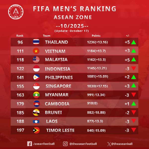 ចំណែកក្នុងតំបន់អាស៊ានវិញ ក្រុមគោព្រៃកម្ពុជា ឈរលេខ៨ ពីលើក្រុមជម្រើសជាតិប្រ៊ុយណេ ឡាវ និងទីម័រខាងកើត៕
