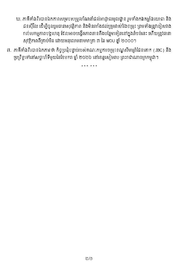 ៧. ភាគីទាំងពីរបានឯកភាពថា កិច្ចប្រជុំបន្ទាប់របស់គណៈកម្មការចម្រុះខណ្ឌសីមាព្រំដែនគោក (JBC) នឹងប្រព្រឹត្តទៅនៅសប្ដាហ៍ទីមួយនៃខែមករា ឆ្នាំ ២០២៦ នៅខេត្តសៀមរាប ព្រះរាជាណាចក្រកម្ពុជា៕