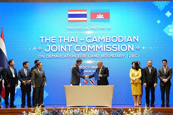 ១. កិច្ចប្រជុំពិសេសគណៈកម្មការចម្រុះខណ្ឌសីមាព្រំដែនគោក (JBC) កម្ពុជា-ថៃ បានធ្វើឡើងនៅខេត្តចន្ទបុរី នៅថ្ងៃទី២១-២២ ខែតុលា ឆ្នាំ២០២៥។ គណៈប្រតិភូកម្ពុជាដឹកនាំដោយ ឯកឧត្តម ឡាំ ជា រដ្ឋមន្តី ទទួលបន្ទុករដ្ឋលេខាធិការដ្ឋានកិច្ចការព្រំដែននៃព្រះរាជាណាចក្រកម្ពុជា និងជាសហប្រធានគណៈកម្មការចម្រុះខណ្ឌសីមាព្រំដែនគោក (JBC) កម្ពុជា-ថៃ (ភាគីកម្ពុជា)។ គណៈប្រតិភូថៃដឹកនាំដោយឯកឧត្តម