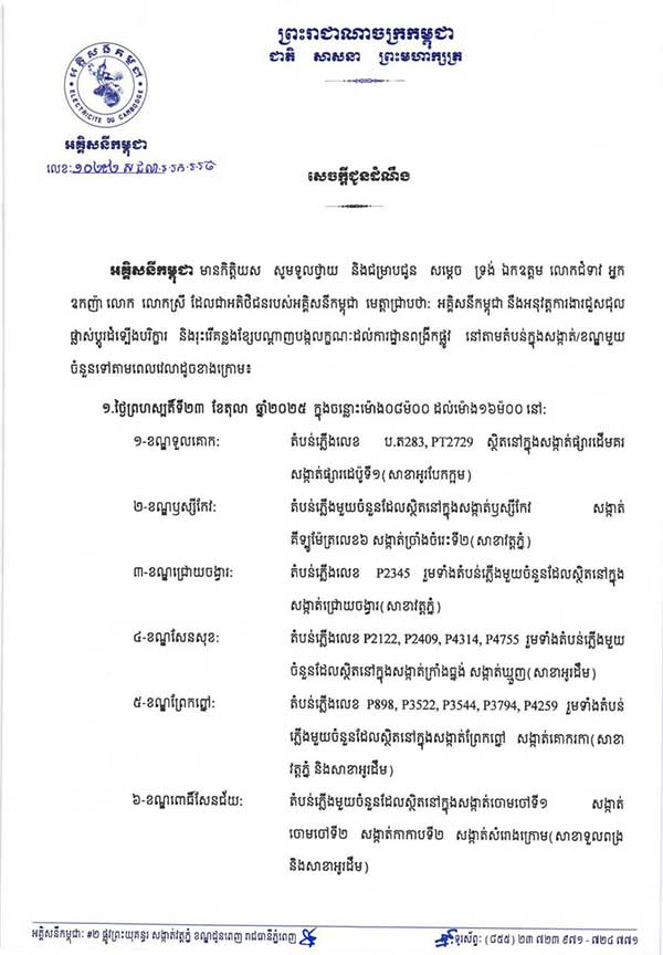 សូមអានសេចក្តីជូនដំណឹងរបស់អគ្គិសនីកម្ពុជា ដូចខាងក្រោម ៖