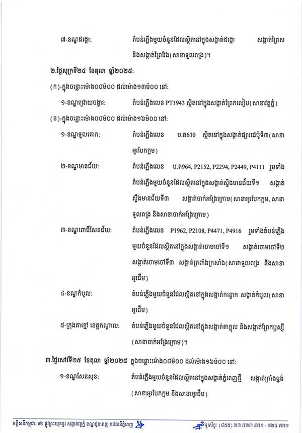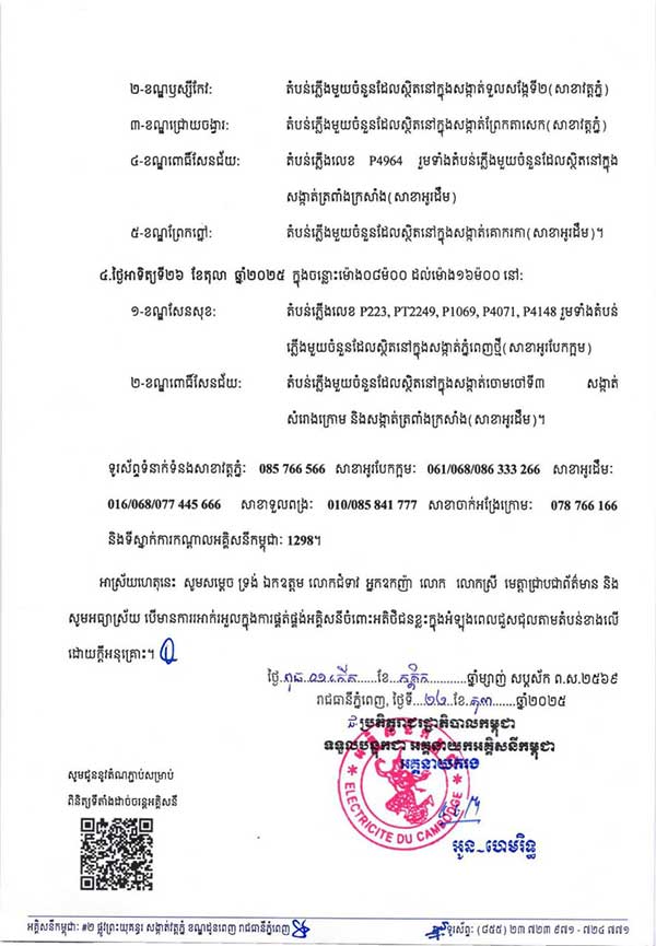 ​EDC ជូនដំណឹងពីការរអាក់រអួលចរន្តតាមតំបន់សង្កាត់ ខណ្ឌមួយចំនួន ចាប់ពីថ្ងៃនេះដល់ថ្ងៃទី២៦ ខែតុលា ​