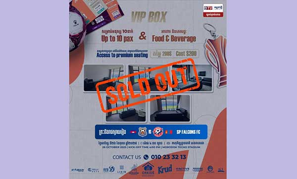 បន្ទប់ VIP BOX ទស្សនាការប្រកួតដំបូងរបស់ព្រះខ័នរាជស្វាយរៀងក្នុងពានរង្វាន់ AFC Challenge League 2025/26 (ពូល D) ជាមួយ SP FALCONS FC នាថ្ងៃទី២៦ ខែតុលា ត្រូវបានលក់អស់។