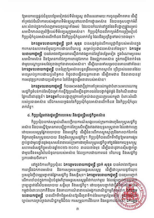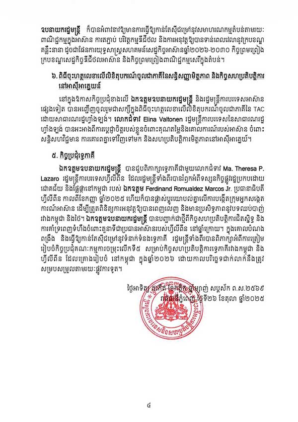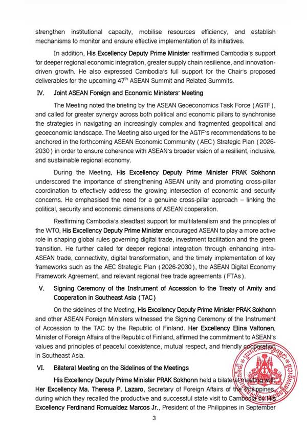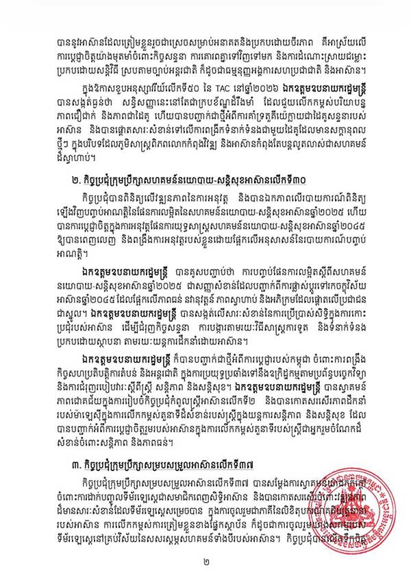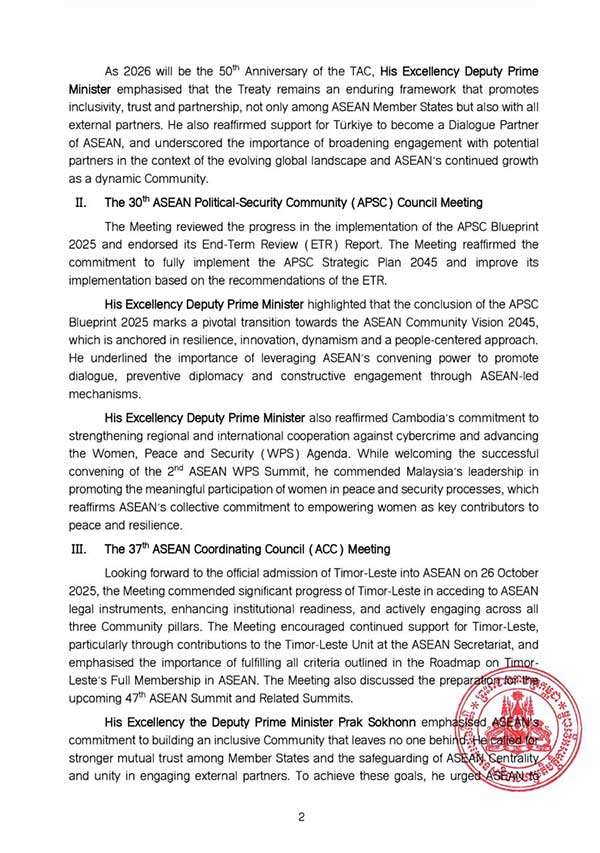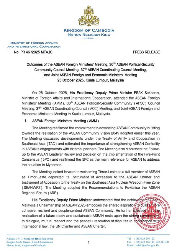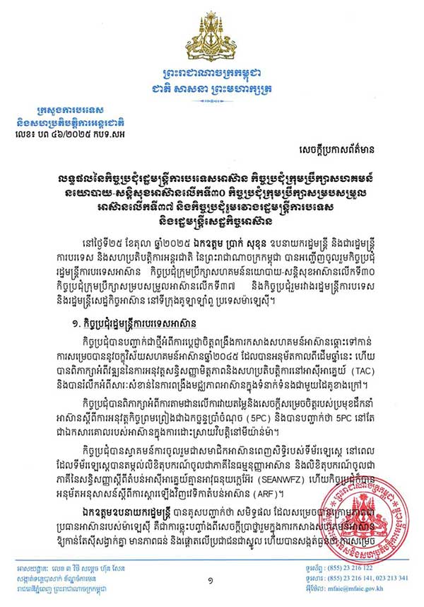 លទ្ធផលនៃកិច្ចប្រជុំរដ្ឋមន្រ្តីការបរទេសអាស៊ាន កិច្ចប្រជុំក្រុមប្រឹក្សាសហគមន៍នយោបាយ-សន្តិសុខអាស៊ានលើកទី៣០ កិច្ចប្រជុំក្រុមប្រឹក្សាសម្របសម្រួលអាស៊ានលើកទី៣៧ និងកិច្ចប្រជុំរួមរវាងរដ្ឋមន្រ្តីការបទេស និងរដ្ឋមន្រ្តីសេដ្ឋកិច្ចអាស៊ាន