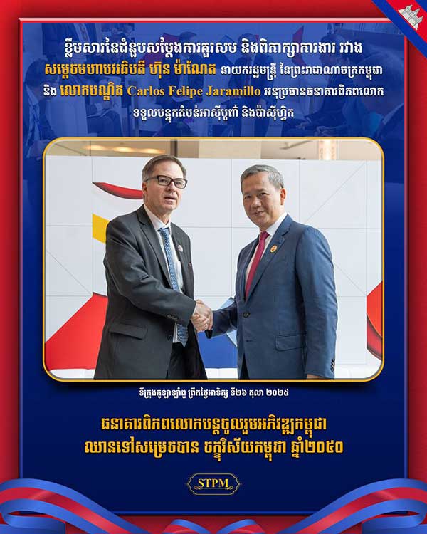 នាព្រឹកថ្ងៃទី២៦ ខែតុលា ឆ្នាំ២០២៥ សម្តេចមហាបវរធិបតី ហ៊ុន ម៉ាណែត នាយករដ្ឋមន្រ្តី នៃព្រះរាជាណាចក្រកម្ពុជា អនុញ្ញាតឱ្យ លោកបណ្ឌិត Carlos Felipe Jaramillo អនុប្រធានធនាគារពិភពលោក ទទួលបន្ទុកតំបន់អាស៊ីបូព៌ា និងប៉ាស៊ីហ្វិក ក្នុងជំនួបសម្តែងការគួរសម និងពិភាក្សាការងារ ក្នុងឱកាសចូលរួមកិច្ចប្រជុំ កំពូលអាស៊ាន លើកទី៤៧ និងកិច្ចប្រជុំកំពូលពាក់ព័ន្ធ នៅទីក្រុងគូឡាឡាំពួ ប្រទេសម៉ាឡេស៊ី ពីថ្ងៃទី២៦-២៨ ខែតុលា ឆ្នាំ២០២៥។