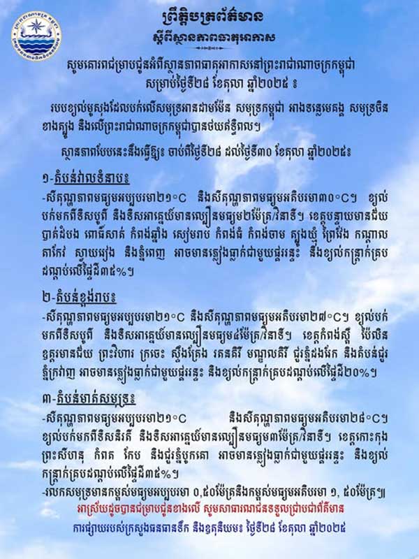 ក្រសួងធនធានទឹក និងឧតុនិយម បានជូនដំណឹងអំពីស្ថានភាពធាតុអាកាសនៅព្រះរាជាណាចក្រកម្ពុជា សម្រាប់ថ្ងៃទី២៨ ខែតុលា ឆ្នាំ២០២៥ ដោយបញ្ជាក់ថារបបខ្យល់មូសុងដែលបក់លើសមុទ្រអានដាមម៉ែន សមុទ្រកម្ពុជា អាងទន្លេមេគង្គ សមុទ្រចិនខាងត្បូង និងលើព្រះរាជាណាចក្រកម្ពុជាបានថយឥទ្ធិពល។