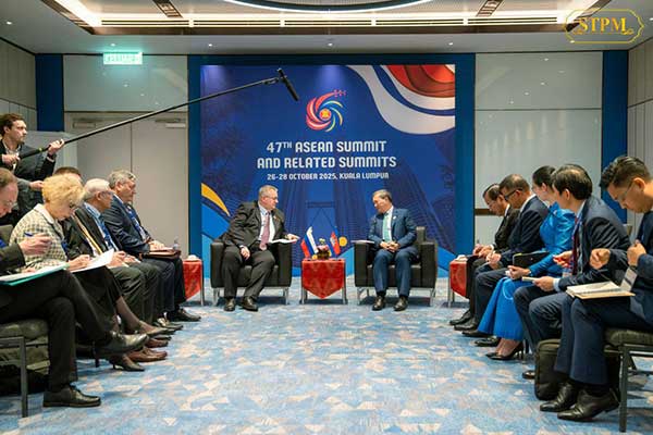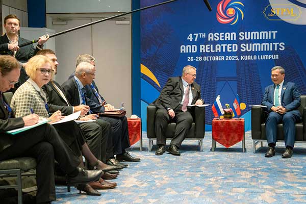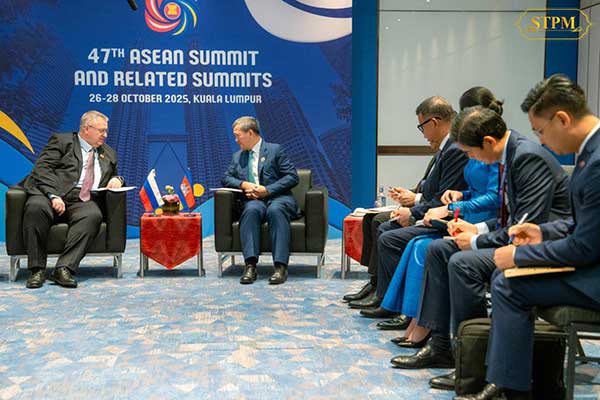 (គូឡាឡាំពួ) ថ្ងៃទី២៨ ខែតុលា ឆ្នាំ២០២៥ សម្តេចមហាបវរធិបតី ហ៊ុន ម៉ាណែត នាយករដ្ឋមន្ត្រី នៃព្រះរាជាណាចក្រកម្ពុជា ទទួលជួបពិភាក្សាការងារទ្វេភាគីជាមួយ ឯកឧត្តម Alexei Overchuk ឧបនាយករដ្ឋមន្ត្រី នៃសហព័ន្ធរុស្ស៊ី នាព្រឹកថ្ងៃទី២៨ ខែតុលា ឆ្នាំ២០២៥ នៅរដ្ឋធានីគូឡាឡាំពួ ប្រទេសម៉ាឡេស៊ី។ (ដកស្រង់៖AKP)